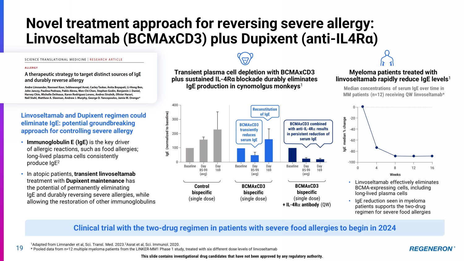 19 Novel treatment approach for reversing severe allergy: Linvoseltamab (BCMAxCD3) plus Dupixent (anti - IL4R α ) This slide contains investigational drug candidates that have not been approved by any regulatory authority. Clinical trial with the two - drug regimen in patients with severe food allergies to begin in 2024 1 Adapted from Limnander et al, Sci. Transl. Med. 2023. 2 Asrat et al, Sci. Immunol. 2020. * Pooled data from n=12 multiple myeloma patients from the LINKER - MM1 Phase 1 study, treated with six different dose levels of lin voseltamab Linvoseltamab and Dupixent regimen could eliminate IgE: potential groundbreaking approach for controlling severe allergy • Immunoglobulin E (IgE) is the key driver of allergic reactions, such as food allergies; long - lived plasma cells consistently produce IgE 2 • In atopic patients, transient linvoseltamab treatment with Dupixent maintenance has the potential of permanently eliminating IgE and durably reversing severe allergies, while allowing the restoration of other immunoglobulins Myeloma patients treated with linvoseltamab rapidly reduce IgE levels 1 • Linvoseltamab effectively eliminates BCMA - expressing cells, including long - lived plasma cells • IgE reduction seen in myeloma patients supports the two - drug regimen for severe food allergies Median concentrations of serum IgE over time in MM patients (n=12) receiving QW linvoseltamab* Transient plasma cell depletion with BCMAxCD3 plus sustained IL - 4R α blockade durably eliminates IgE production in cynomolgus monkeys 1 Control bispecific (single dose) BCMAxCD3 bispecific (single dose) + IL - 4R ⍺ antibody (QW) BCMAxCD3 bispecific (single dose) BCMAxCD3 transiently reduces serum IgE Reconstitution of IgE BCMAxCD3 combined with anti - IL - 4R ⍺ results in persistent reduction of serum IgE