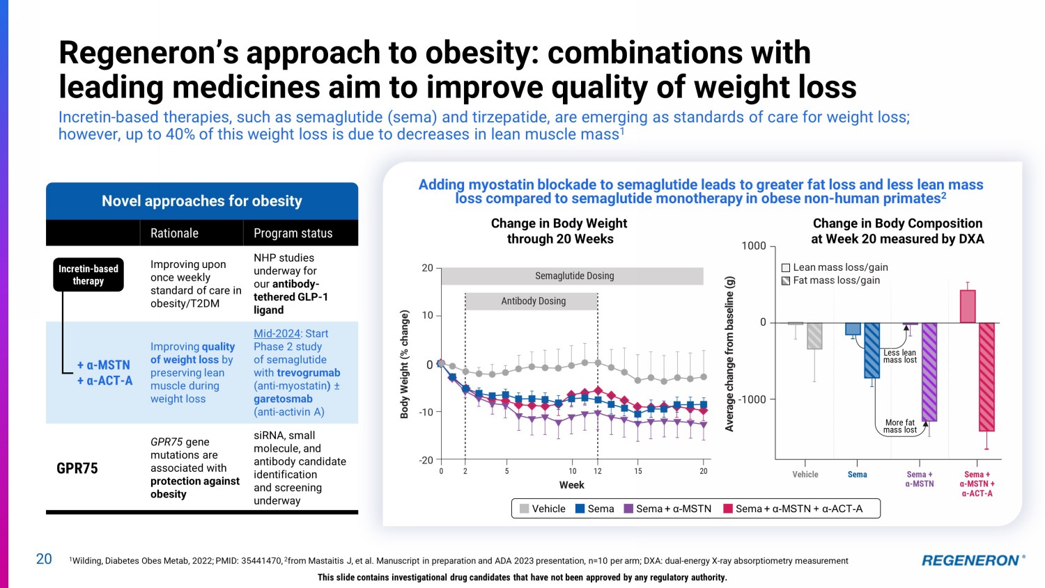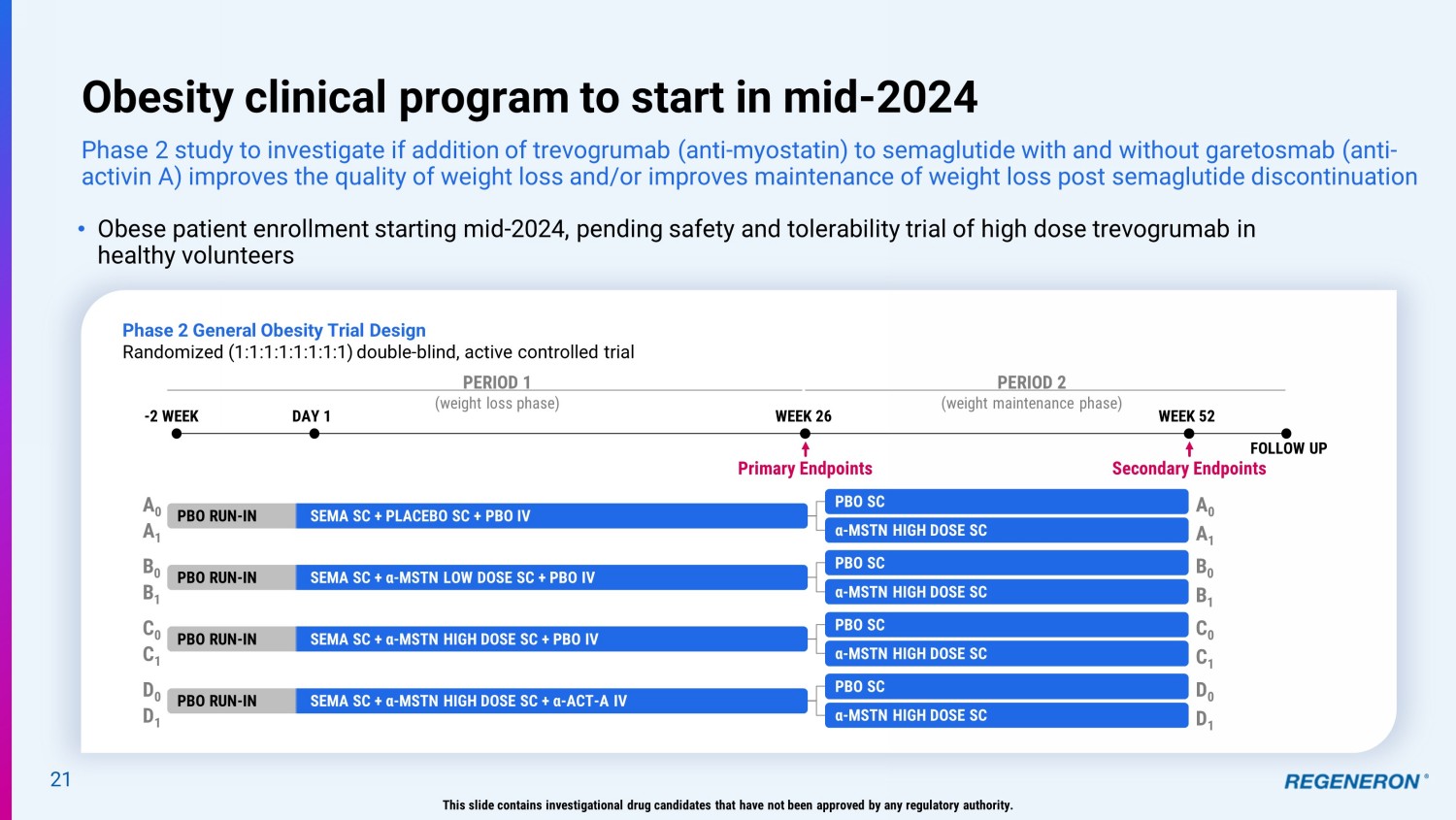 20 Regeneron’s approach to obesity: combinations with leading medicines aim to improve quality of weight loss Incretin - based therapies, such as semaglutide (sema) and tirzepatide, are emerging as standards of care for weight loss; however, up to 40% of this weight loss is due to decreases in lean muscle mass 1 Novel approaches for obesity Rationale Program status GLP1R Improving upon once weekly standard of care in obesity/T2DM NHP studies underway for our antibody - tethered GLP - 1 ligand + α - MSTN + α - ACT - A Improving quality of weight loss by preserving lean muscle during weight loss Mid - 2024 : Start Phase 2 study of semaglutide with trevogrumab (anti - myostatin ) ± garetosmab ( anti - activin A) GPR75 GPR75 gene mutations are associated with protection against obesity siRNA, small molecule, and antibody candidate identification and screening underway 1 Wilding, Diabetes Obes Metab, 2022; PMID: 35441470, 2 from Mastaitis J, et al. Manuscript in preparation and ADA 2023 presentation, n=10 per arm; DXA: dual - energy X - ray absorptiometr y measurement Adding myostatin blockade to semaglutide leads to greater fat loss and less lean mass loss compared to semaglutide monotherapy in obese non - human primates 2 This slide contains investigational drug candidates that have not been approved by any regulatory authority. Incretin - based therapy Change in Body Weight through 20 Weeks Average change from baseline (g) Vehicle Sema Sema + α - MSTN Sema + α - MSTN + α - ACT - A Change in Body Composition at Week 20 measured by DXA Sema + α - MSTN + α - ACT - A Sema + α - MSTN Sema Vehicle Lean m ass loss/gain F at m ass loss/gain 1000 - 1000 0 More fat mass lost Less lean mass lost