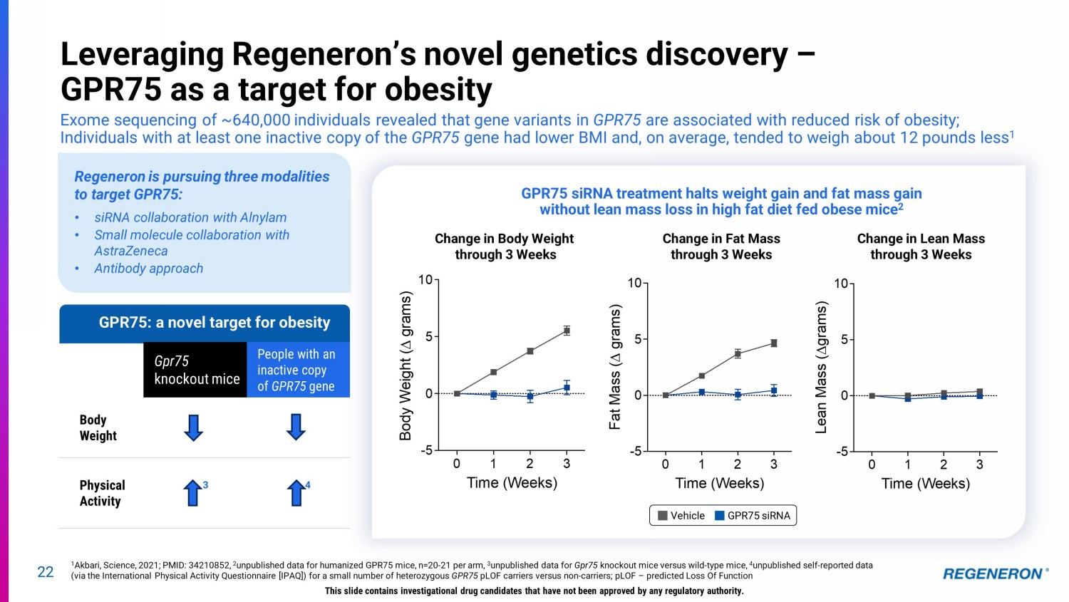 22 Leveraging Regeneron’s novel genetics discovery – GPR75 as a target for obesity Exome sequencing of ~640,000 individuals revealed that gene variants in GPR75 are associated with reduced risk of obesity; Individuals with at least one inactive copy of the GPR75 gene had lower BMI and, on average, tended to weigh about 12 pounds less 1 GPR75: a novel target for obesity 1 Akbari, Science, 2021; PMID: 34210852, 2 unpublished data for humanized GPR75 mice, n=20 - 21 per arm, 3 unpublished data for Gpr75 knockout mice versus wild - type mice, 4 unpublished self - reported data (via the International Physical Activity Questionnaire [IPAQ]) for a small number of heterozygous GPR75 pLOF carriers versus non - carriers; pLOF – predicted Loss Of Function GPR75 siRNA treatment halts weight gain and fat mass gain without lean mass loss in high fat diet fed obese mice 2 This slide contains investigational drug candidates that have not been approved by any regulatory authority. Change in Body Weight through 3 Weeks Vehicle GPR75 siRNA Change in Fat Mass through 3 Weeks Change in Lean Mass through 3 Weeks 0 1 2 3 -5 0 5 10 Time (Weeks) B o d y W e i g h t ( D g r a m s ) 0 1 2 3 -5 0 5 10 Time (Weeks) F a t M a s s ( D g r a m s ) 0 1 2 3 -5 0 5 10 Time (Weeks) L e a n M a s s ( D g r a m s ) Regeneron is pursuing three modalities to target GPR75: • siRNA collaboration with Alnylam • Small molecule collaboration with AstraZeneca • Antibody approach Gpr75 knockout mice People with an inactive copy of GPR75 gene Body Weight Physical Activity 3 4