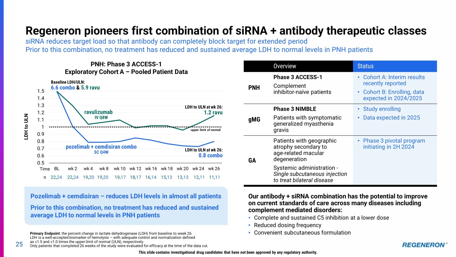 24 Regeneron Genetic Medicines pipeline Phase 3 Phase 2 Phase 1 Select Pre - IND Candidates CIDEB * CIDEB siRNA NASH HTT * HTT siRNA Huntington’s Disease Factor 9 † F9 CRISPR + AAV Hemophilia B GAA † GAA CRISPR + AAV Pompe Disease GJB2/DB - 103 GJB2 AAV GJB2 - related Hearing Loss DB - OTO | OTOF AAV Dual Vector Gene Therapy OTOF - related Hearing Loss ANL - PNP * PNPLA3 siRNA NASH ALN - APP * APP siRNA Early - onset Alzheimer’s Disease and Cerebral Amyloid Angiopathy ALN - HSD HSD17B13 siRNA NASH Pozelimab + Cemdisiran C5 Antibody + C5 siRNA Myasthenia gravis and Paroxysmal Nocturnal Hemoglobinuria; Geographic atrophy initiating in 2H 2024 NTLA - 2001 † CRISPR/Cas9 Transthyretin Amyloidosis (ATTR) with cardiomyopathy This slide contains investigational drug candidates that have not been approved by any regulatory authority. SOD1 * SOD1 siRNA SOD1 ALS Collaboration with: *Alnylam; † Intellia.