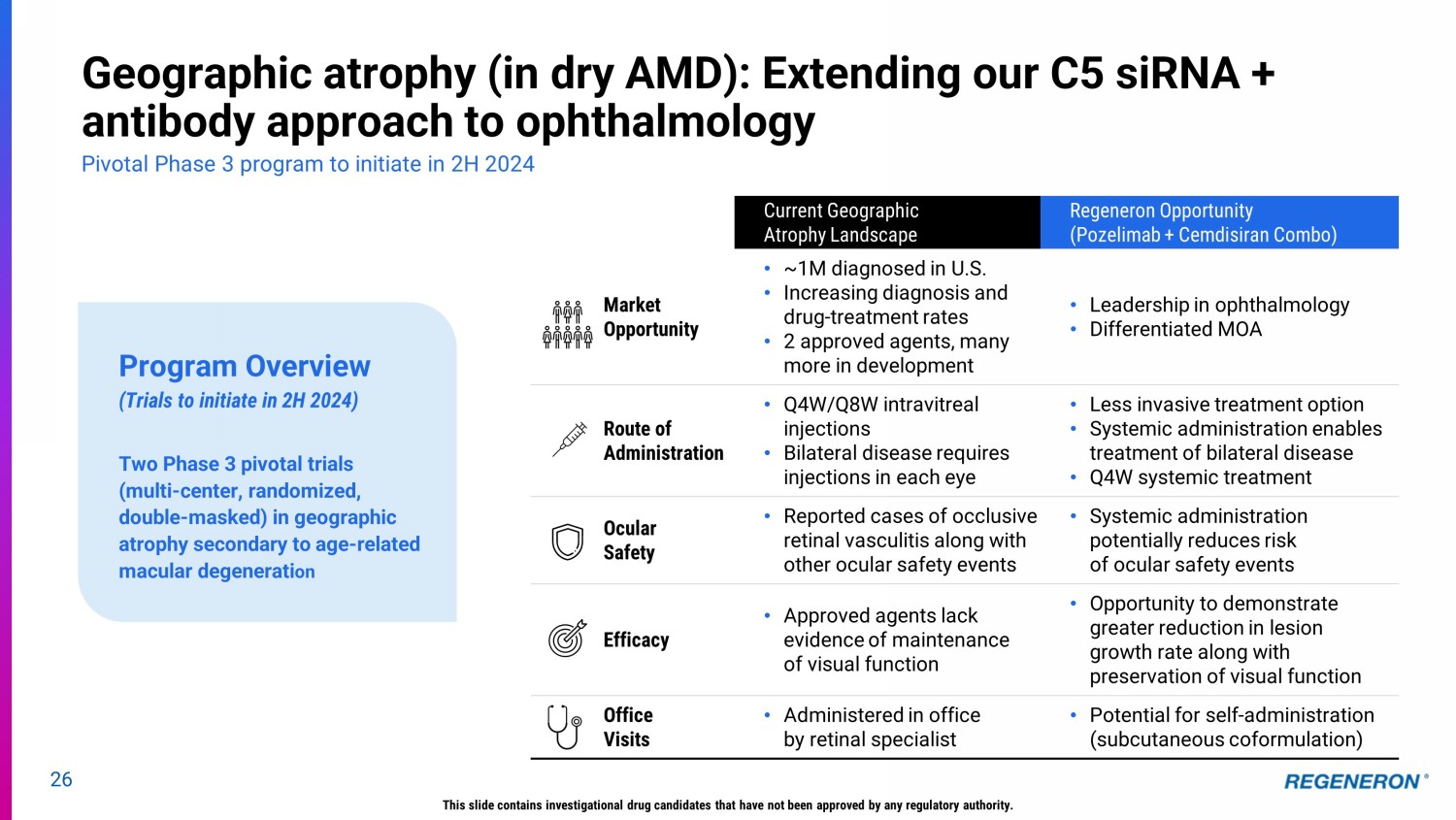 25 Regeneron pioneers first combination of siRNA + antibody therapeutic classes Overview Status PNH Phase 3 ACCESS - 1 Complement inhibitor - naïve patients • Cohort A: Interim results recently reported • Cohort B: Enrolling, data expected in 2024/2025 gMG Phase 3 NIMBLE Patients with symptomatic generalized myasthenia gravis • Study enrolling • Data expected in 2025 GA Patients with geographic atrophy secondary to age - related macular degeneration Systemic administration - Single subcutaneous injection to treat bilateral disease • Phase 3 pivotal program initiating in 2H 2024 0.5 0.6 0.7 0.8 0.9 1 1.1 1.2 1.3 1.4 1.5 BL wk 2 wk 4 wk 8 wk 10 wk 12 wk 16 wk 18 wk 20 wk 24 wk 26 LDH to ULN Time LDH to ULN at wk 26: 0.8 combo Baseline LDH/ULN: 6.6 combo & 5.9 ravu 22 , 24 19 , 20 19 , 20 19 , 17 18 , 17 16 , 14 15 , 13 13 , 13 12 , 11 11 , 11 22 , 24 n LDH to ULN at wk 26: 1.2 ravu upper limit of normal pozelimab + cemdisiran combo SC Q4W ravulizumab IV Q8W Primary Endpoint : the percent change in lactate dehydrogenase (LDH) from baseline to week 26. LDH is a well - accepted biomarker of hemolysis – with adequate control and normalization defined as ≤1.5 and ≤1.0 times the upper limit of normal (ULN), respectively. Only patients that completed 26 weeks of the study were evaluated for efficacy at the time of the data cut. This slide contains investigational drug candidates that have not been approved by any regulatory authority. Our antibody + siRNA combination has the potential to improve on current standards of care across many diseases including complement mediated disorders: • Complete and sustained C5 inhibition at a lower dose • Reduced dosing frequency • Convenient subcutaneous formulation PNH: Phase 3 ACCESS - 1 Exploratory Cohort A – Pooled Patient Data Pozelimab + cemdisiran – reduces LDH levels in almost all patients Prior to this combination, no treatment has reduced and sustained average LDH to normal levels in PNH patients siRNA reduces target load so that antibody can completely block target for extended period Prior to this combination, no treatment has reduced and sustained average LDH to normal levels in PNH patients