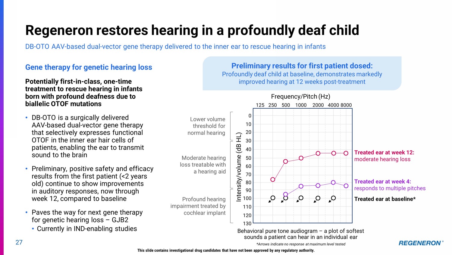 Regeneron restores hearing in a profoundly deaf child 27 Gene therapy for genetic hearing loss Potentially first - in - class, one - time treatment to rescue hearing in infants born with profound deafness due to biallelic OTOF mutations • DB - OTO is a surgically delivered AAV - based dual - vector gene therapy that selectively expresses functional OTOF in the inner ear hair cells of patients, enabling the ear to transmit sound to the brain • Preliminary, positive safety and efficacy results from the first patient (<2 years old) continue to show improvements in auditory responses, now through week 12, compared to baseline • Paves the way for next gene therapy for genetic hearing loss – GJB2 • Currently in IND - enabling studies DB - OTO AAV - based dual - vector gene therapy delivered to the inner ear to rescue hearing in infants Preliminary results for first patient dosed: Profoundly deaf child at baseline, demonstrates markedly improved hearing at 12 weeks post - treatment Intensity/volume (dB HL) Frequency/Pitch (Hz) Behavioral pure tone audiogram – a plot of softest sounds a patient can hear in an individual ear *Arrows indicate no response at maximum level tested Lower volume threshold for normal hearing Profound hearing impairment treated by cochlear implant Moderate hearing loss treatable with a hearing aid 125 250 500 1000 2000 4000 8000 0 10 20 30 40 50 60 70 80 90 100 110 120 130 Treated ear at week 12: moderate hearing loss Treated ear at week 4: responds to multiple pitches Treated ear at baseline* This slide contains investigational drug candidates that have not been approved by any regulatory authority.