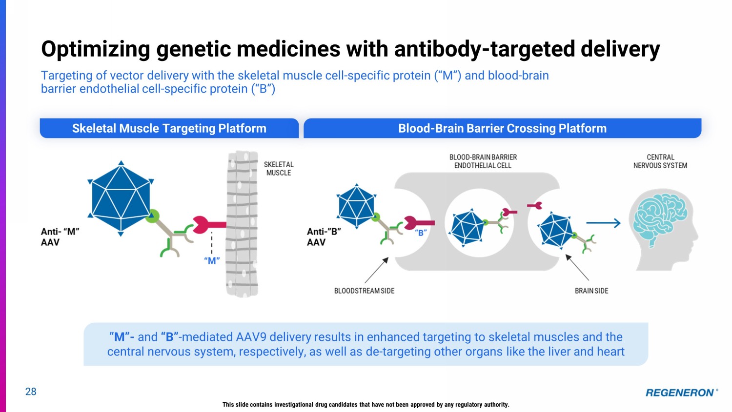 28 Optimizing genetic medicines with antibody - targeted delivery Targeting of vector delivery with the skeletal muscle cell - specific protein (“M”) and blood - brain barrier endothelial cell - specific protein (“B”) “M” - and “B” - mediated AAV9 delivery results in enhanced targeting to skeletal muscles and the central nervous system, respectively, as well as de - targeting other organs like the liver and heart Skeletal Muscle Targeting Platform Blood - Brain Barrier Crossing Platform This slide contains investigational drug candidates that have not been approved by any regulatory authority.