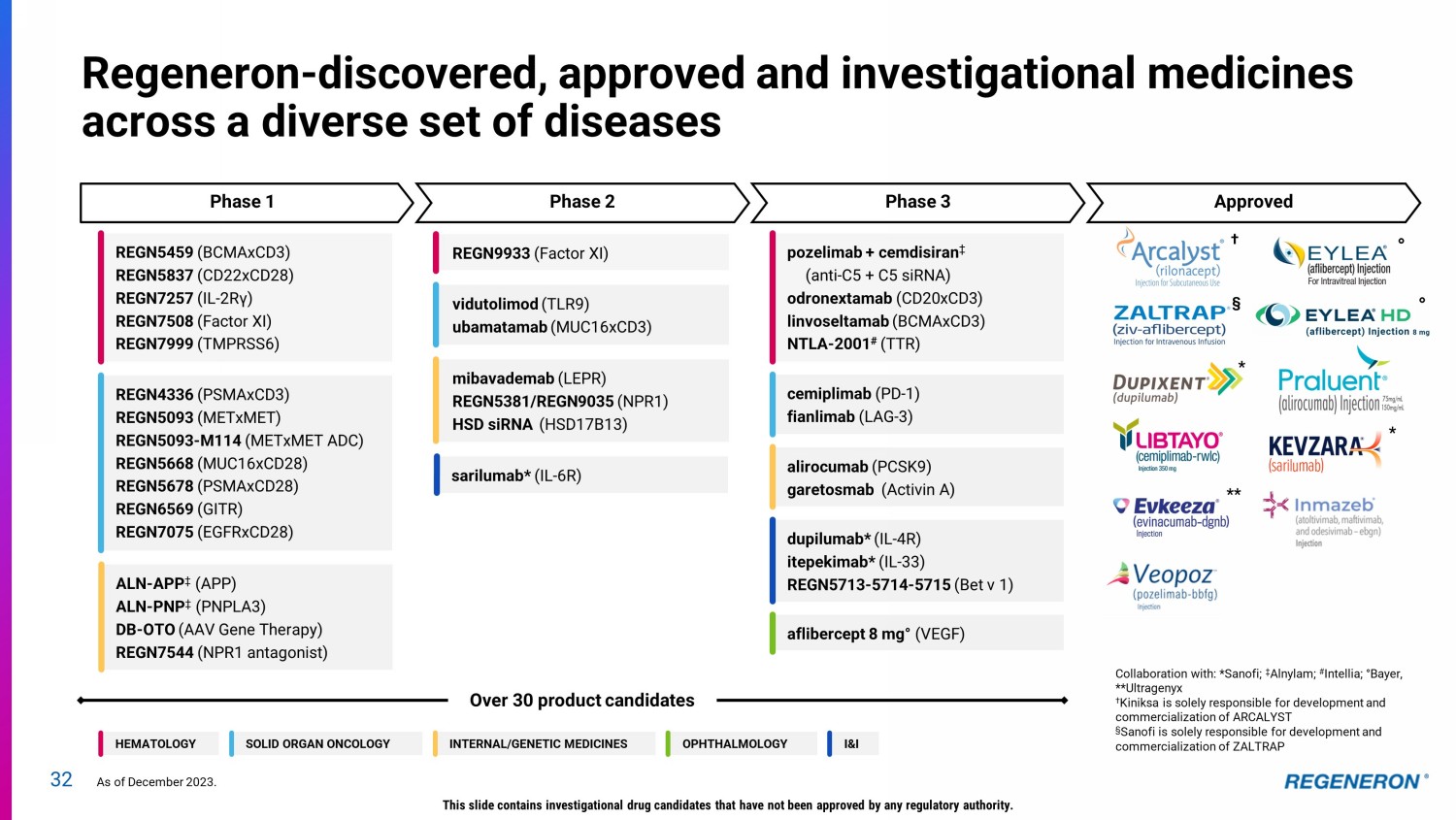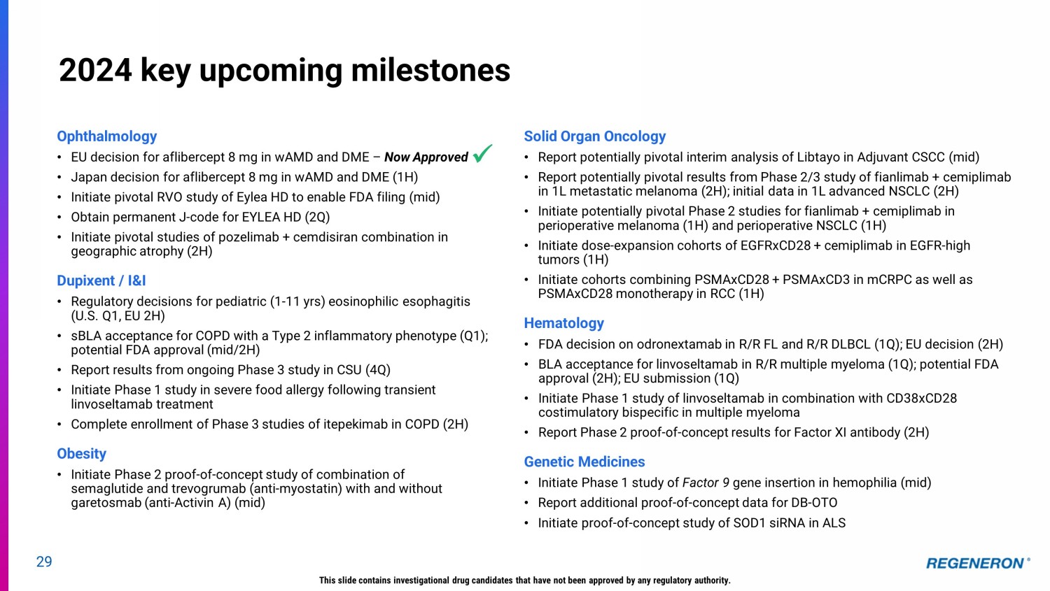 29 2024 key upcoming milestones Ophthalmology • EU decision for aflibercept 8 mg in wAMD and DME – Now Approved • Japan decision for aflibercept 8 mg in wAMD and DME (1H) • Initiate pivotal RVO study of Eylea HD to enable FDA filing (mid) • Obtain permanent J - code for EYLEA HD (2Q) • Initiate pivotal studies of pozelimab + cemdisiran combination in geographic atrophy (2H) Dupixent / I&I • Regulatory decisions for pediatric (1 - 11 yrs) eosinophilic esophagitis (U.S. Q1, EU 2H) • sBLA acceptance for COPD with a Type 2 inflammatory phenotype (Q1); potential FDA approval (mid/2H) • Report results from ongoing Phase 3 study in CSU (4Q) • Initiate Phase 1 study in severe food allergy following transient linvoseltamab treatment • Complete enrollment of Phase 3 studies of itepekimab in COPD (2H) Obesity • Initiate Phase 2 proof - of - concept study of combination of semaglutide and trevogrumab (anti - myostatin) with and without garetosmab (anti - Activin A) (mid) Solid Organ Oncology • Report potentially pivotal interim analysis of Libtayo in Adjuvant CSCC (mid) • Report potentially pivotal results from Phase 2/3 study of fianlimab + cemiplimab in 1L metastatic melanoma (2H); initial data in 1L advanced NSCLC (2H) • Initiate potentially pivotal Phase 2 studies for fianlimab + cemiplimab in perioperative melanoma (1H) and perioperative NSCLC (1H) • Initiate do se - expansion cohorts of EGFRxCD28 + cemiplimab in EGFR - high tumors (1H) • Initiate cohorts combining PSMAxCD28 + PSMAxCD3 in mCRPC as well as PSMAxCD28 monotherapy in RCC (1H) Hematology • FDA decision on odronextamab in R/R FL and R/R DLBCL ( 1Q ); EU decision (2H) • BLA acceptance for linvoseltamab in R/R multiple myeloma (1Q); potential FDA approval (2H); EU submission (1Q) • Initiate Phase 1 study of linvoseltamab in combination with CD38xCD28 costimulatory bispecific in multiple myeloma • Report Phase 2 proof - of - concept results for Factor XI antibody (2H) Genetic Medicines • Initiate Phase 1 study of Factor 9 gene insertion in hemophilia (mid) • Report additional proof - of - concept data for DB - OTO • Initiate proof - of - concept study of SOD1 siRNA in ALS This slide contains investigational drug candidates that have not been approved by any regulatory authority. x