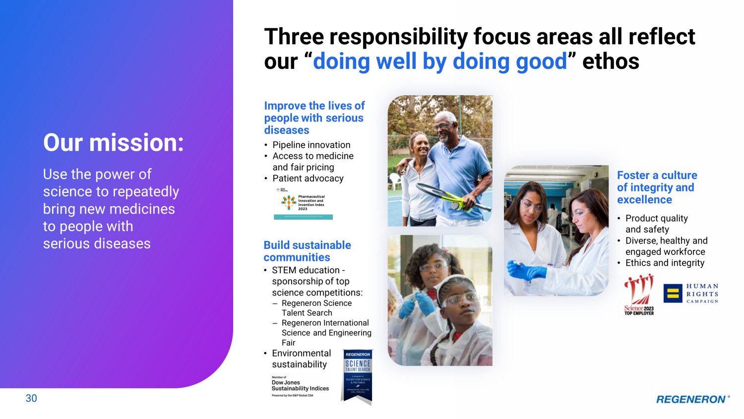 Three responsibility focus areas all reflect our “ doing well by doing good ” ethos 30 Improve the lives of people with serious diseases Foster a culture of integrity and excellence Build sustainable communities • Product quality and safety • Diverse, healthy and engaged workforce • Ethics and integrity • STEM education - sponsorship of top science competitions: – Regeneron Science Talent Search – Regeneron International Science and Engineering Fair • Environmental sustainability • Pipeline innovation • Access to medicine and fair pricing • Patient advocacy Our mission: Use the power of science to repeatedly bring new medicines to people with serious diseases