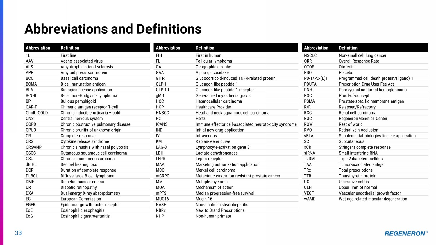 33 Abbreviations and Definitions Abbreviation Definition 1L First line AAV Adeno - associated virus ALS Amyotrophic lateral sclerosis APP Amyloid precursor protein BCC Basal cell carcinoma BCMA B - cell maturation antigen BLA Biologics license application B - NHL B - cell non - Hodgkin’s lymphoma BP Bullous pemphigoid CAR - T Chimeric antigen receptor T - cell CIndU - COLD Chronic inducible urticaria – cold CNS Central nervous system COPD Chronic obstructive pulmonary disease CPUO Chronic pruritis of unknown origin CR Complete response CRS Cytokine release syndrome CRSwNP Chronic sinusitis with nasal polyposis CSCC Cutaneous squamous cell carcinoma CSU Chronic spontaneous urticaria dB HL Decibel hearing loss DCR Duration of complete response DLBCL Diffuse large B - cell lymphoma DME Diabetic macular edema DR Diabetic retinopathy DXA Dual - energy X - ray absorptiometry EC European Commission EGFR Epidermal growth factor receptor EoE Eosinophilic esophagitis EoG Eosinophilic gastroenteritis Abbreviation Definition FIH First in human FL Follicular lymphoma GA Geographic atrophy GAA Alpha glucosidase GITR Glucocorticoid - induced TNFR - related protein GLP - 1 Glucagon - like peptide 1 GLP - 1R Glucagon - like peptide 1 receptor gMG Generalized myasthenia gravis HCC Hepatocellular carcinoma HCP Healthcare Provider HNSCC Head and neck squamous cell carcinoma Hz Hertz ICANS Immune effector cell - associated neurotoxicity syndrome IND Initial new drug application IV Intravenous KM Kaplan - Meier curve LAG - 3 Lymphocyte - activation gene 3 LDH Lactate dehydrogenase LEPR Leptin receptor MAA Marketing authorization application MCC Merkel cell carcinoma mCRPC Metastatic castration - resistant prostate cancer MM Multiple myeloma MOA Mechanism of action mPFS Median progression - free survival MUC16 Mucin 16 NASH Non - alcoholic steatohepatitis NBRx New to Brand Prescriptions NHP Non - human primate Abbreviation Definition NSCLC Non - small cell lung cancer ORR Overall Response Rate OTOF Otoferlin PBO Placebo PD - 1/PD - (L)1 Programmed cell death protein/(ligand) 1 PDUFA Prescription Drug User Fee Act PNH Paroxysmal nocturnal hemoglobinuria POC Proof - of - concept PSMA Prostate - specific membrane antigen R/R Relapsed/Refractory RCC Renal cell carcinoma RGC Regeneron Genetics Center ROW Rest of world RVO Retinal vein occlusion sBLA Supplemental biologics license application SC Subcutaneous sCR Stringent complete response siRNA Small interfering RNA T2DM Type 2 diabetes mellitus TAA Tumor - associated antigen TRx Total prescriptions TTR Transthyretin protein UC Ulcerative colitis ULN Upper limit of normal VEGF Vascular endothelial growth factor wAMD Wet age - related macular degeneration