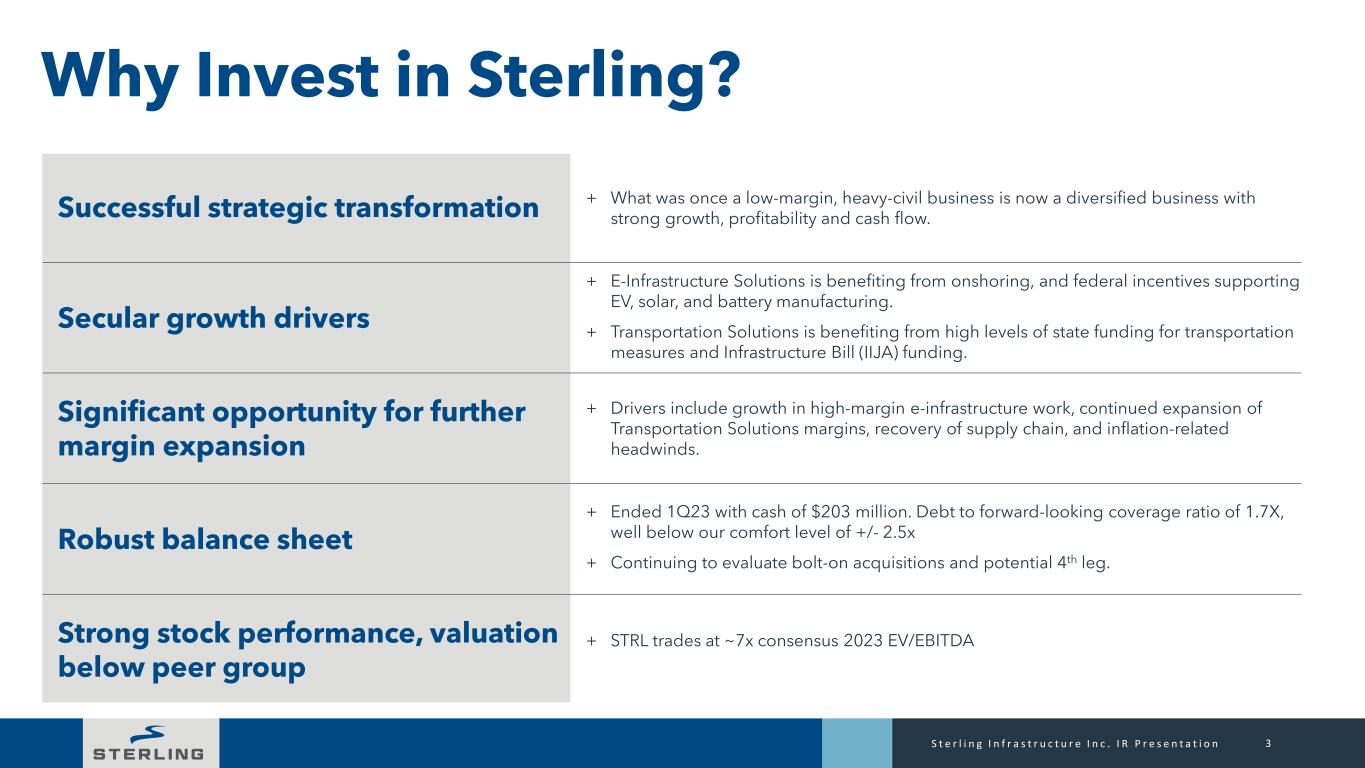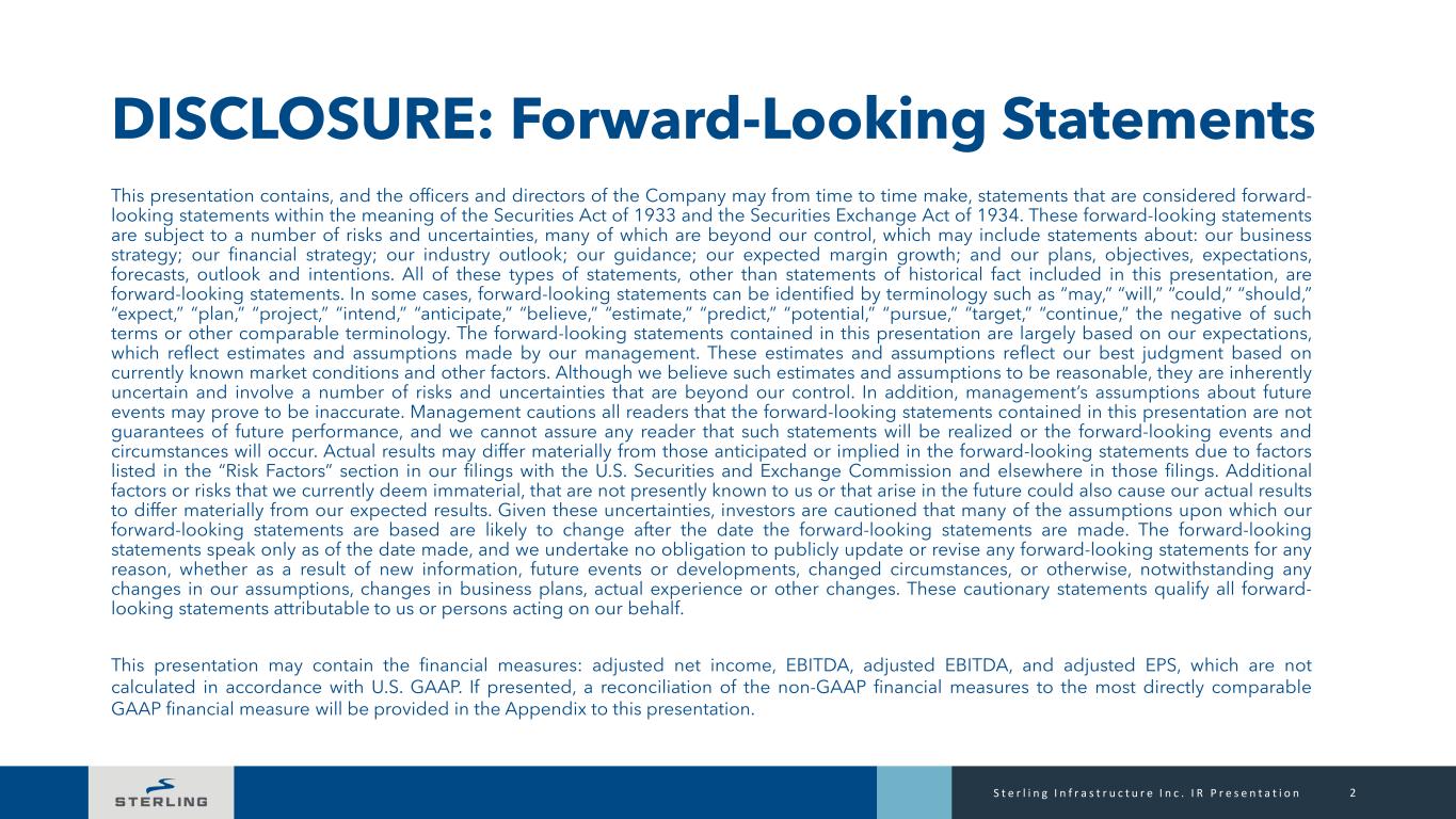 DISCLOSURE: Forward-Looking Statements This presentation contains, and the officers and directors of the Company may from time to time make, statements that are considered forward- looking statements within the meaning of the Securities Act of 1933 and the Securities Exchange Act of 1934. These forward-looking statements are subject to a number of risks and uncertainties, many of which are beyond our control, which may include statements about: our business strategy; our financial strategy; our industry outlook; our guidance; our expected margin growth; and our plans, objectives, expectations, forecasts, outlook and intentions. All of these types of statements, other than statements of historical fact included in this presentation, are forward-looking statements. In some cases, forward-looking statements can be identified by terminology such as “may,” “will,” “could,” “should,” “expect,” “plan,” “project,” “intend,” “anticipate,” “believe,” “estimate,” “predict,” “potential,” “pursue,” “target,” “continue,” the negative of such terms or other comparable terminology. The forward-looking statements contained in this presentation are largely based on our expectations, which reflect estimates and assumptions made by our management. These estimates and assumptions reflect our best judgment based on currently known market conditions and other factors. Although we believe such estimates and assumptions to be reasonable, they are inherently uncertain and involve a number of risks and uncertainties that are beyond our control. In addition, management’s assumptions about future events may prove to be inaccurate. Management cautions all readers that the forward-looking statements contained in this presentation are not guarantees of future performance, and we cannot assure any reader that such statements will be realized or the forward-looking events and circumstances will occur. Actual results may differ materially from those anticipated or implied in the forward-looking statements due to factors listed in the “Risk Factors” section in our filings with the U.S. Securities and Exchange Commission and elsewhere in those filings. Additional factors or risks that we currently deem immaterial, that are not presently known to us or that arise in the future could also cause our actual results to differ materially from our expected results. Given these uncertainties, investors are cautioned that many of the assumptions upon which our forward-looking statements are based are likely to change after the date the forward-looking statements are made. The forward-looking statements speak only as of the date made, and we undertake no obligation to publicly update or revise any forward-looking statements for any reason, whether as a result of new information, future events or developments, changed circumstances, or otherwise, notwithstanding any changes in our assumptions, changes in business plans, actual experience or other changes. These cautionary statements qualify all forward- looking statements attributable to us or persons acting on our behalf. This presentation may contain the financial measures: adjusted net income, EBITDA, adjusted EBITDA, and adjusted EPS, which are not calculated in accordance with U.S. GAAP. If presented, a reconciliation of the non-GAAP financial measures to the most directly comparable GAAP financial measure will be provided in the Appendix to this presentation. S t e r l i n g I n f r a s t r u c t u r e I n c . I R P r e s e n t a t i o n 2