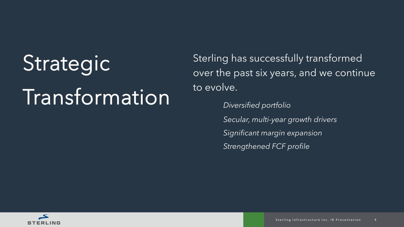 S t e r l i n g I n f r a s t r u c t u r e I n c . I R P r e s e n t a t i o n Why Invest in Sterling? + What was once a low-margin, heavy-civil business is now a diversified business with strong growth, profitability and cash flow. + E-Infrastructure Solutions is benefiting from onshoring, and federal incentives supporting EV, solar, and battery manufacturing. + Transportation Solutions is benefiting from high levels of state funding for transportation measures and Infrastructure Bill (IIJA) funding. + Drivers include growth in high-margin e-infrastructure work, continued expansion of Transportation Solutions margins, recovery of supply chain, and inflation-related headwinds. + Ended 1Q23 with cash of $203 million. Debt to forward-looking coverage ratio of 1.7X, well below our comfort level of +/- 2.5x + Continuing to evaluate bolt-on acquisitions and potential 4th leg. + STRL trades at ~7x consensus 2023 EV/EBITDA Successful strategic transformation Secular growth drivers Significant opportunity for further margin expansion Robust balance sheet Strong stock performance, valuation below peer group 3