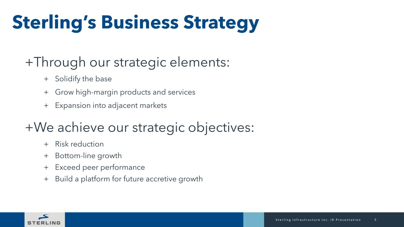 Strategic Transformation Sterling has successfully transformed over the past six years, and we continue to evolve. Diversified portfolio Secular, multi-year growth drivers Significant margin expansion Strengthened FCF profile S t e r l i n g I n f r a s t r u c t u r e I n c . I R P r e s e n t a t i o n 4