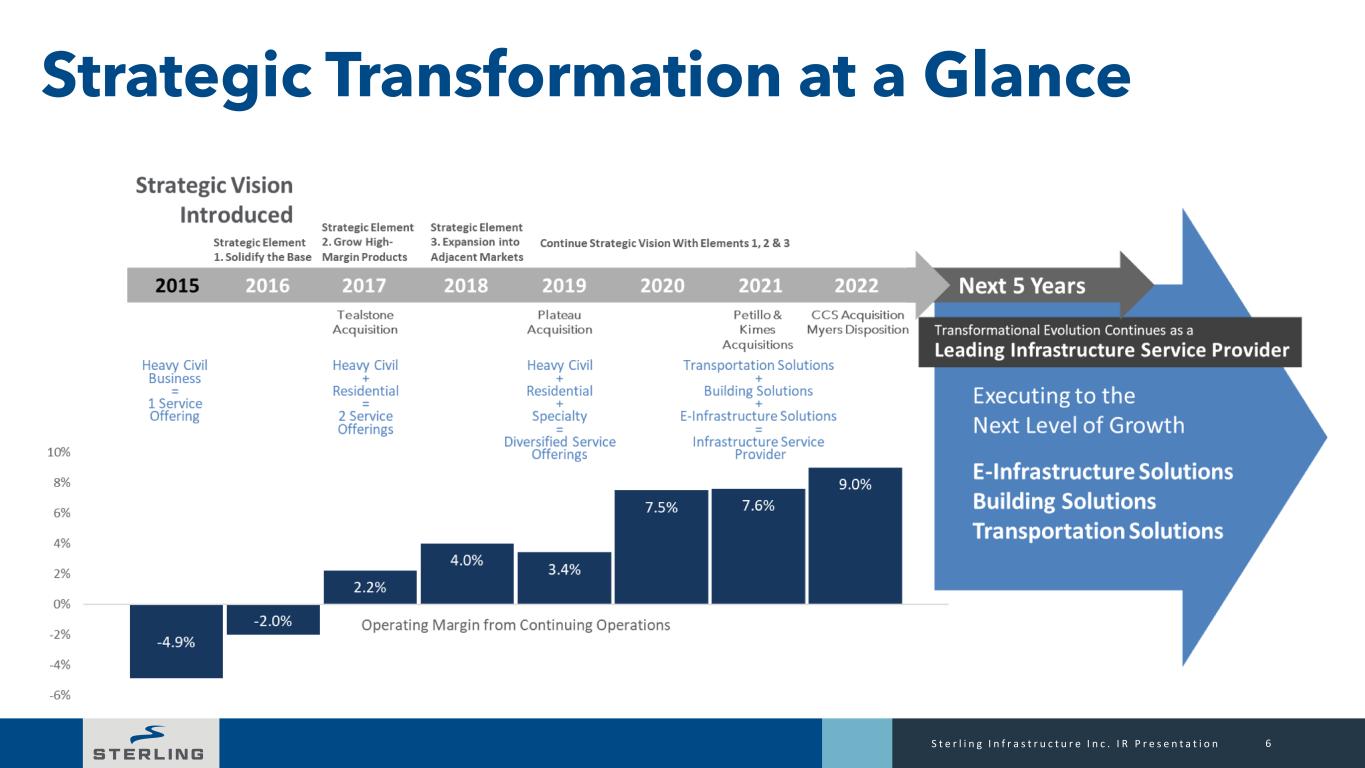 +Through our strategic elements: + Solidify the base + Grow high-margin products and services + Expansion into adjacent markets +We achieve our strategic objectives: + Risk reduction + Bottom-line growth + Exceed peer performance + Build a platform for future accretive growth Sterling’s Business Strategy S t e r l i n g I n f r a s t r u c t u r e I n c . I R P r e s e n t a t i o n 5