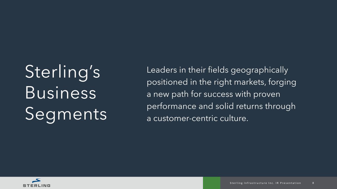 With Continued Operating Margin Improvement S t e r l i n g I n f r a s t r u c t u r e I n c . I R P r e s e n t a t i o n Strategic Execution 2022 Revenue and Operating Margin reflect Continuing Operations. 2016 includes operations that have since been divested. Solidify the base Prioritized risk reduction | Improved bid discipline | Significantly reduced the probability of project losses Grow high-margin products and services Project mix shift | Targeted higher-margin projects | Significantly reduced lower-margin work Expand into adjacent markets Decentralized, adaptive business model | Focused on bottom-line growth | Diversification 7 Successful Strategic Transformation to a Leading Infrastructure Service Provider Building Solutions 18% E-Infrastructure Solutions 51% Transportation Solutions 31% 2022 Revenue $1.77 Billion 2016 Revenue $533.9 Million Heavy Civil 94% -2% 9.0% -2% 0% 2% 4% 6% 8% 10% 2016 2022