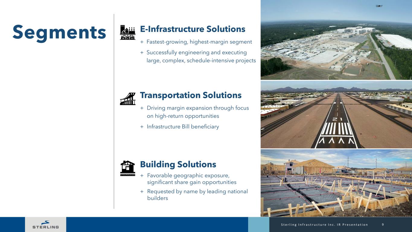 Sterling’s Business Segments Leaders in their fields geographically positioned in the right markets, forging a new path for success with proven performance and solid returns through a customer-centric culture. S t e r l i n g I n f r a s t r u c t u r e I n c . I R P r e s e n t a t i o n 8