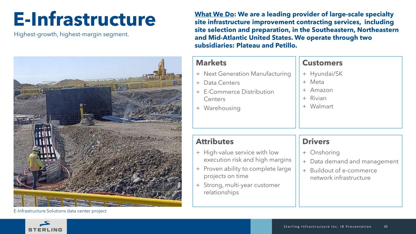 E-Infrastructure Solutions + Fastest-growing, highest-margin segment + Successfully engineering and executing large, complex, schedule-intensive projects Transportation Solutions + Driving margin expansion through focus on high-return opportunities + Infrastructure Bill beneficiary Building Solutions + Favorable geographic exposure, significant share gain opportunities + Requested by name by leading national builders Segments S t e r l i n g I n f r a s t r u c t u r e I n c . I R P r e s e n t a t i o n 9