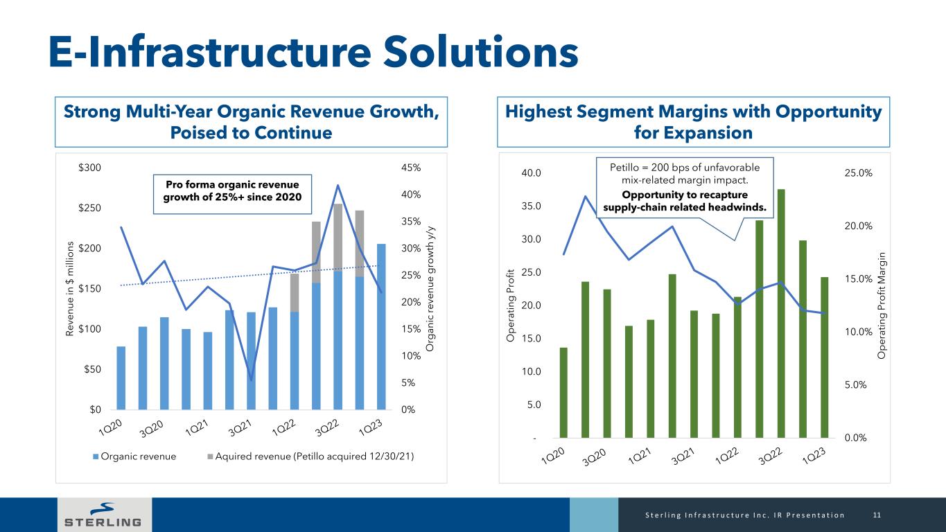 S t e r l i n g I n f r a s t r u c t u r e I n c . I R P r e s e n t a t i o n E-Infrastructure Highest-growth, highest-margin segment. Markets + Next Generation Manufacturing + Data Centers + E-Commerce Distribution Centers + Warehousing What We Do: We are a leading provider of large-scale specialty site infrastructure improvement contracting services, including site selection and preparation, in the Southeastern, Northeastern and Mid-Atlantic United States. We operate through two subsidiaries: Plateau and Petillo. E-Infrastructure Solutions data center project Attributes + High-value service with low execution risk and high margins + Proven ability to complete large projects on time + Strong, multi-year customer relationships Drivers + Onshoring + Data demand and management + Buildout of e-commerce network infrastructure Customers + Hyundai/SK + Meta + Amazon + Rivian + Walmart 10