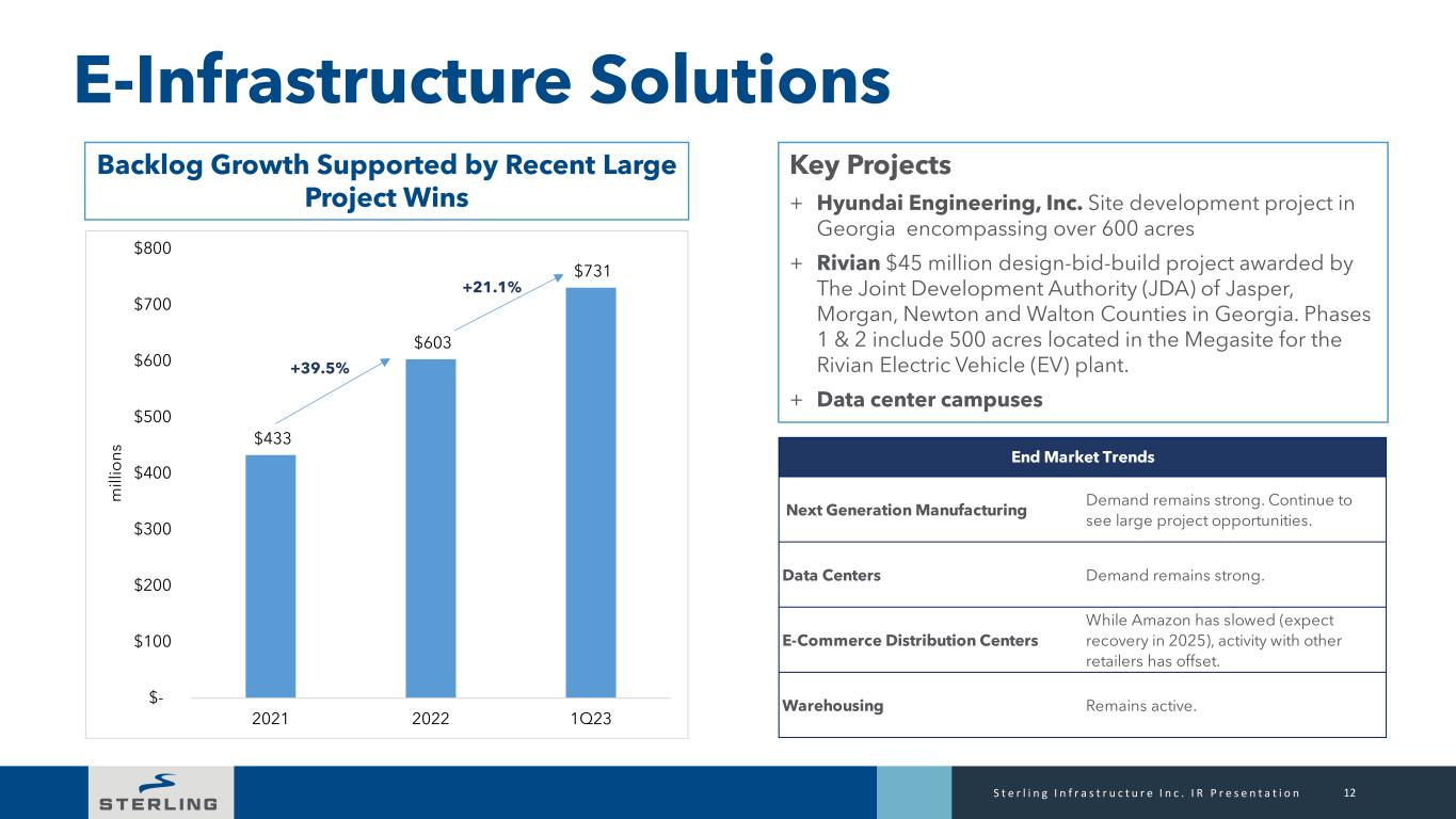 S t e r l i n g I n f r a s t r u c t u r e I n c . I R P r e s e n t a t i o n E-Infrastructure Solutions Strong Multi-Year Organic Revenue Growth, Poised to Continue Highest Segment Margins with Opportunity for Expansion 0% 5% 10% 15% 20% 25% 30% 35% 40% 45% $0 $50 $100 $150 $200 $250 $300 O rg an ic re ve nu e g ro w th y /y R ev en ue in $ m ill io ns Organic revenue Aquired revenue (Petillo acquired 12/30/21) Pro forma organic revenue growth of 25%+ since 2020 11 0.0% 5.0% 10.0% 15.0% 20.0% 25.0% - 5.0 10.0 15.0 20.0 25.0 30.0 35.0 40.0 O p er at in g P ro fit M ar g in O p er at in g P ro fit Petillo = 200 bps of unfavorable mix-related margin impact. Opportunity to recapture supply-chain related headwinds.