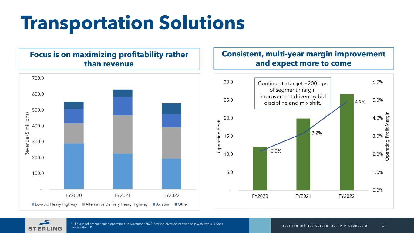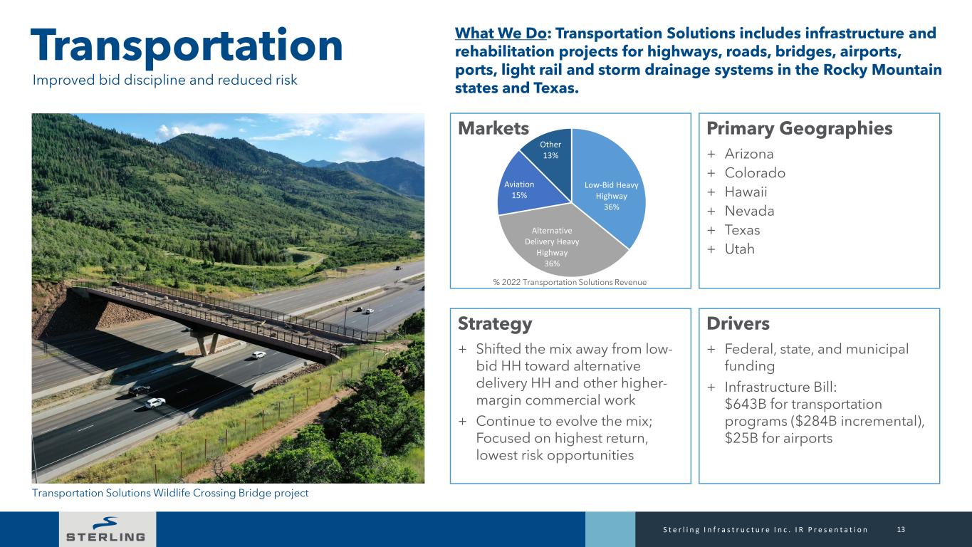 Markets Low-Bid Heavy Highway 36% Alternative Delivery Heavy Highway 36% Aviation 15% Other 13% S t e r l i n g I n f r a s t r u c t u r e I n c . I R P r e s e n t a t i o n Transportation Improved bid discipline and reduced risk What We Do: Transportation Solutions includes infrastructure and rehabilitation projects for highways, roads, bridges, airports, ports, light rail and storm drainage systems in the Rocky Mountain states and Texas. Transportation Solutions Wildlife Crossing Bridge project Strategy + Shifted the mix away from low- bid HH toward alternative delivery HH and other higher- margin commercial work + Continue to evolve the mix; Focused on highest return, lowest risk opportunities Drivers + Federal, state, and municipal funding + Infrastructure Bill: $643B for transportation programs ($284B incremental), $25B for airports Primary Geographies + Arizona + Colorado + Hawaii + Nevada + Texas + Utah % 2022 Transportation Solutions Revenue 13