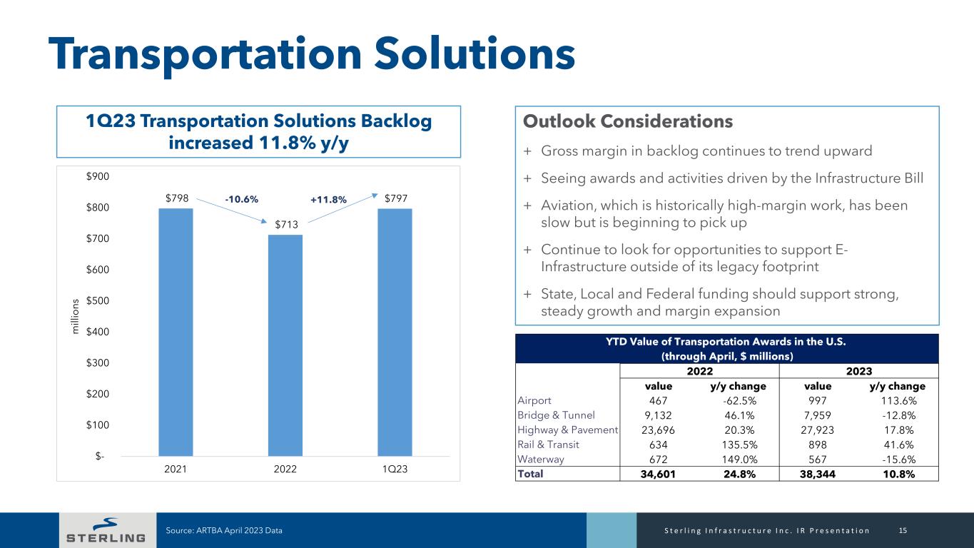 S t e r l i n g I n f r a s t r u c t u r e I n c . I R P r e s e n t a t i o n Transportation Solutions All figures reflect continuing operations. In November 2022, Sterling divested its ownership with Myers & Sons construction LP Focus is on maximizing profitability rather than revenue Consistent, multi-year margin improvement and expect more to come 2.2% 3.2% 4.9% 0.0% 1.0% 2.0% 3.0% 4.0% 5.0% 6.0% - 5.0 10.0 15.0 20.0 25.0 30.0 FY2020 FY2021 FY2022 O p er at in g P ro fit M ar g in O p er at in g P ro fit Continue to target ~200 bps of segment margin improvement driven by bid discipline and mix shift. 14