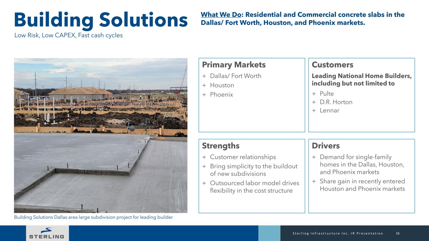 S t e r l i n g I n f r a s t r u c t u r e I n c . I R P r e s e n t a t i o n Transportation Solutions Source: ARTBA April 2023 Data Outlook Considerations + Gross margin in backlog continues to trend upward + Seeing awards and activities driven by the Infrastructure Bill + Aviation, which is historically high-margin work, has been slow but is beginning to pick up + Continue to look for opportunities to support E- Infrastructure outside of its legacy footprint + State, Local and Federal funding should support strong, steady growth and margin expansion 1Q23 Transportation Solutions Backlog increased 11.8% y/y 15 value y/y change value y/y change Airport 467 -62.5% 997 113.6% Bridge & Tunnel 9,132 46.1% 7,959 -12.8% Highway & Pavement 23,696 20.3% 27,923 17.8% Rail & Transit 634 135.5% 898 41.6% Waterway 672 149.0% 567 -15.6% Total 34,601 24.8% 38,344 10.8% 2022 2023 YTD Value of Transportation Awards in the U.S. (through April, $ millions) $798 $713 $797 $- $100 $200 $300 $400 $500 $600 $700 $800 $900 2021 2022 1Q23 m ill io ns -10.6% +11.8%