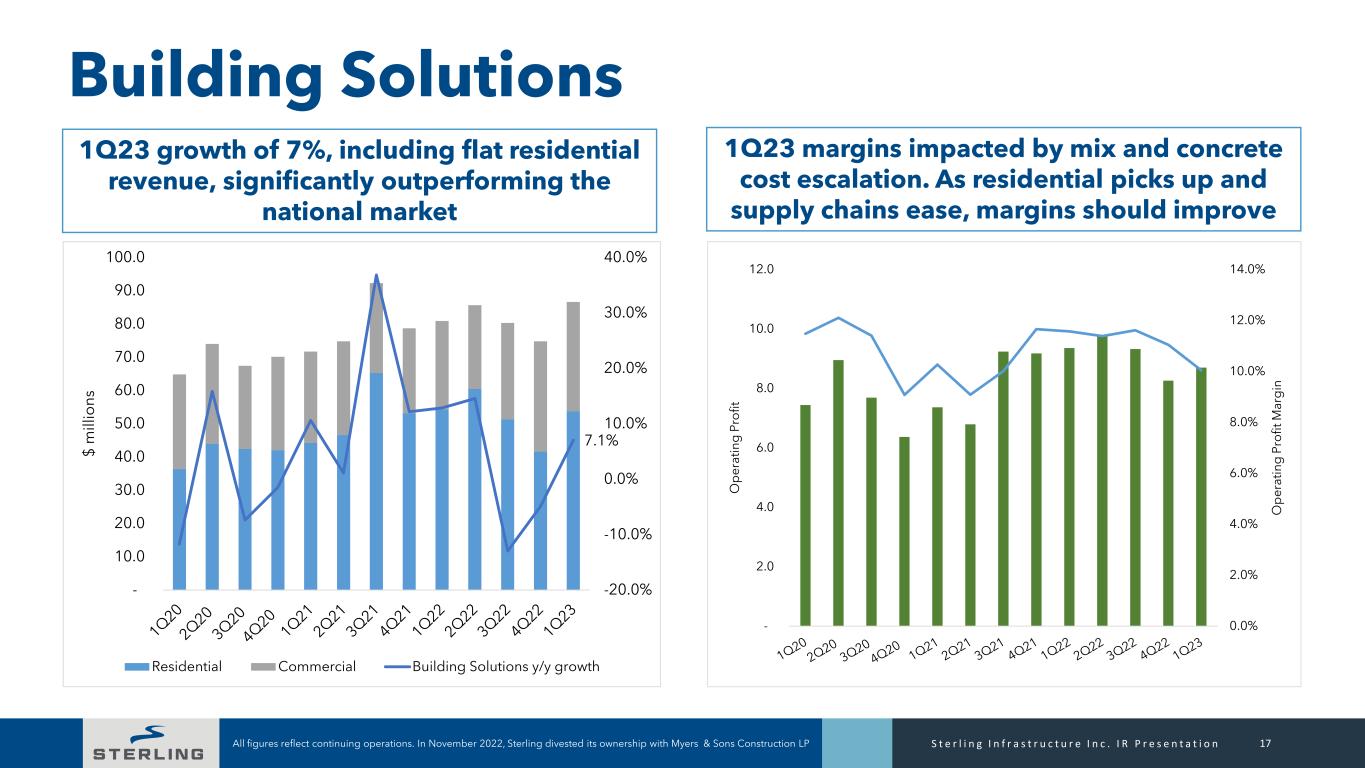 S t e r l i n g I n f r a s t r u c t u r e I n c . I R P r e s e n t a t i o n Building Solutions All figures reflect continuing operations. In November 2022, Sterling divested its ownership with Myers & Sons Construction LP 1Q23 growth of 7%, including flat residential revenue, significantly outperforming the national market 7.1% -20.0% -10.0% 0.0% 10.0% 20.0% 30.0% 40.0% - 10.0 20.0 30.0 40.0 50.0 60.0 70.0 80.0 90.0 100.0 $ m ill io ns Residential Commercial Building Solutions y/y growth 1Q23 margins impacted by mix and concrete cost escalation. As residential picks up and supply chains ease, margins should improve 17 0.0% 2.0% 4.0% 6.0% 8.0% 10.0% 12.0% 14.0% - 2.0 4.0 6.0 8.0 10.0 12.0 O p er at in g P ro fit M ar g in O p er at in g P ro fit