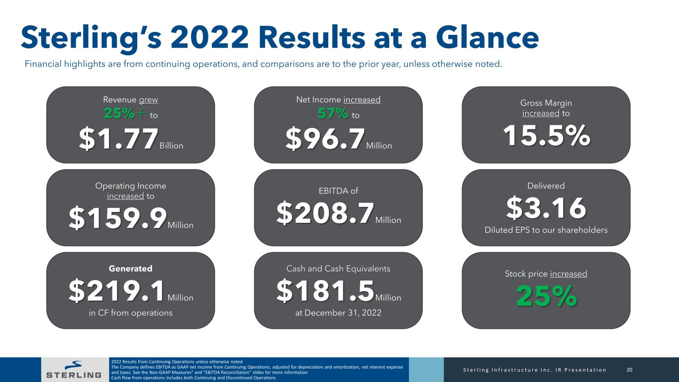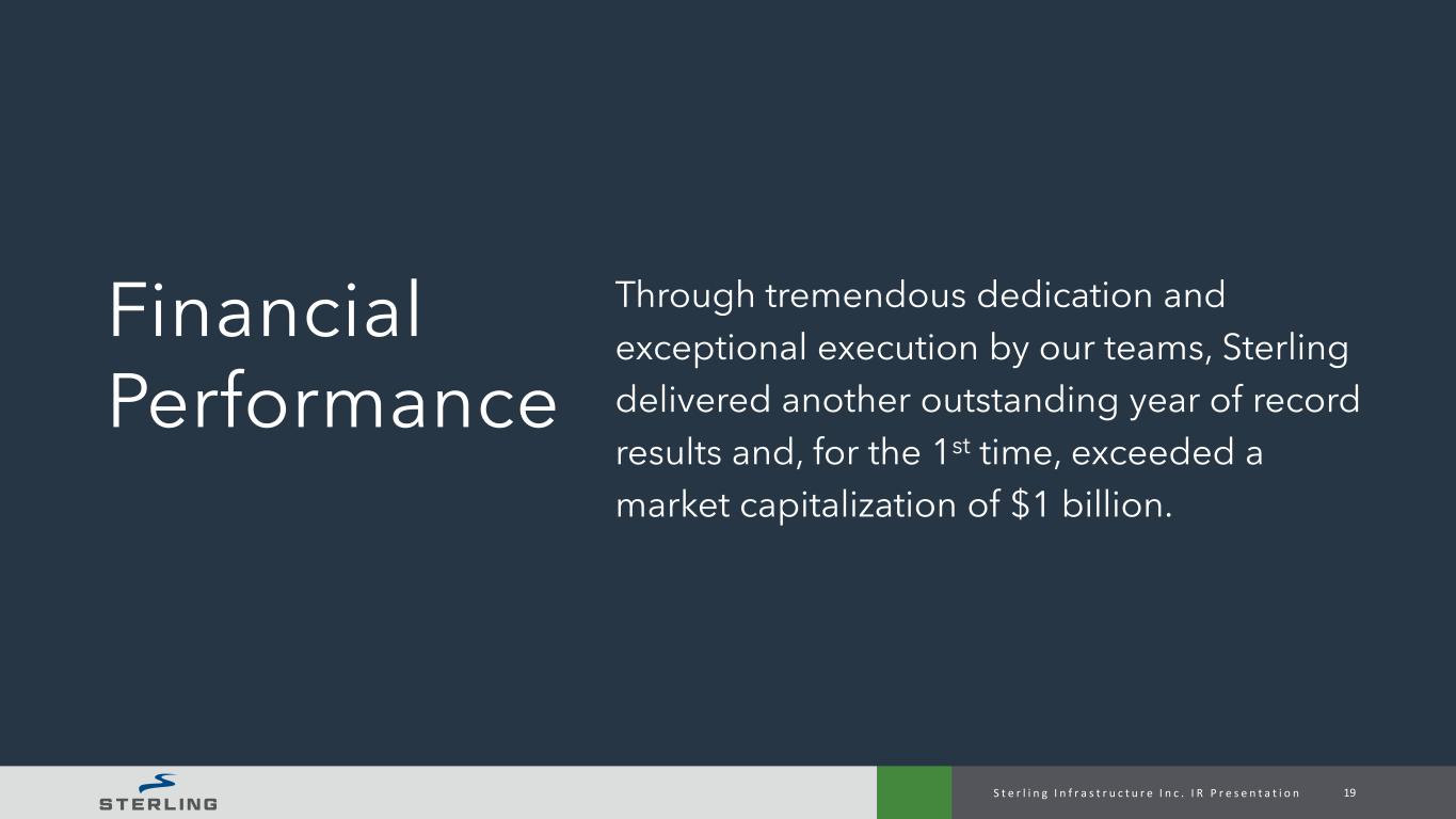 Financial Performance Through tremendous dedication and exceptional execution by our teams, Sterling delivered another outstanding year of record results and, for the 1st time, exceeded a market capitalization of $1 billion. S t e r l i n g I n f r a s t r u c t u r e I n c . I R P r e s e n t a t i o n 19
