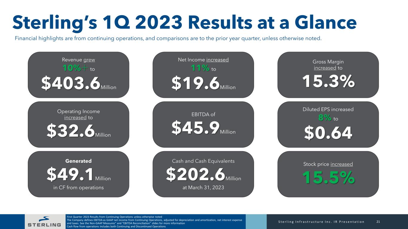 S t e r l i n g I n f r a s t r u c t u r e I n c . I R P r e s e n t a t i o n Sterling’s 2022 Results at a Glance 2022 Results from Continuing Operations unless otherwise noted The Company defines EBITDA as GAAP net income from Continuing Operations, adjusted for depreciation and amortization, net interest expense and taxes. See the Non-GAAP Measures” and “EBITDA Reconciliation” slides for more information Cash flow from operations includes both Continuing and Discontinued Operations Revenue grew 25% to $1.77Billion Net Income increased 57% to $96.7Million EBITDA of $208.7Million Operating Income increased to $159.9Million Generated $219.1Million in CF from operations Gross Margin increased to 15.5% Delivered $3.16 Diluted EPS to our shareholders Cash and Cash Equivalents $181.5Million at December 31, 2022 Stock price increased 25% Financial highlights are from continuing operations, and comparisons are to the prior year, unless otherwise noted. 20