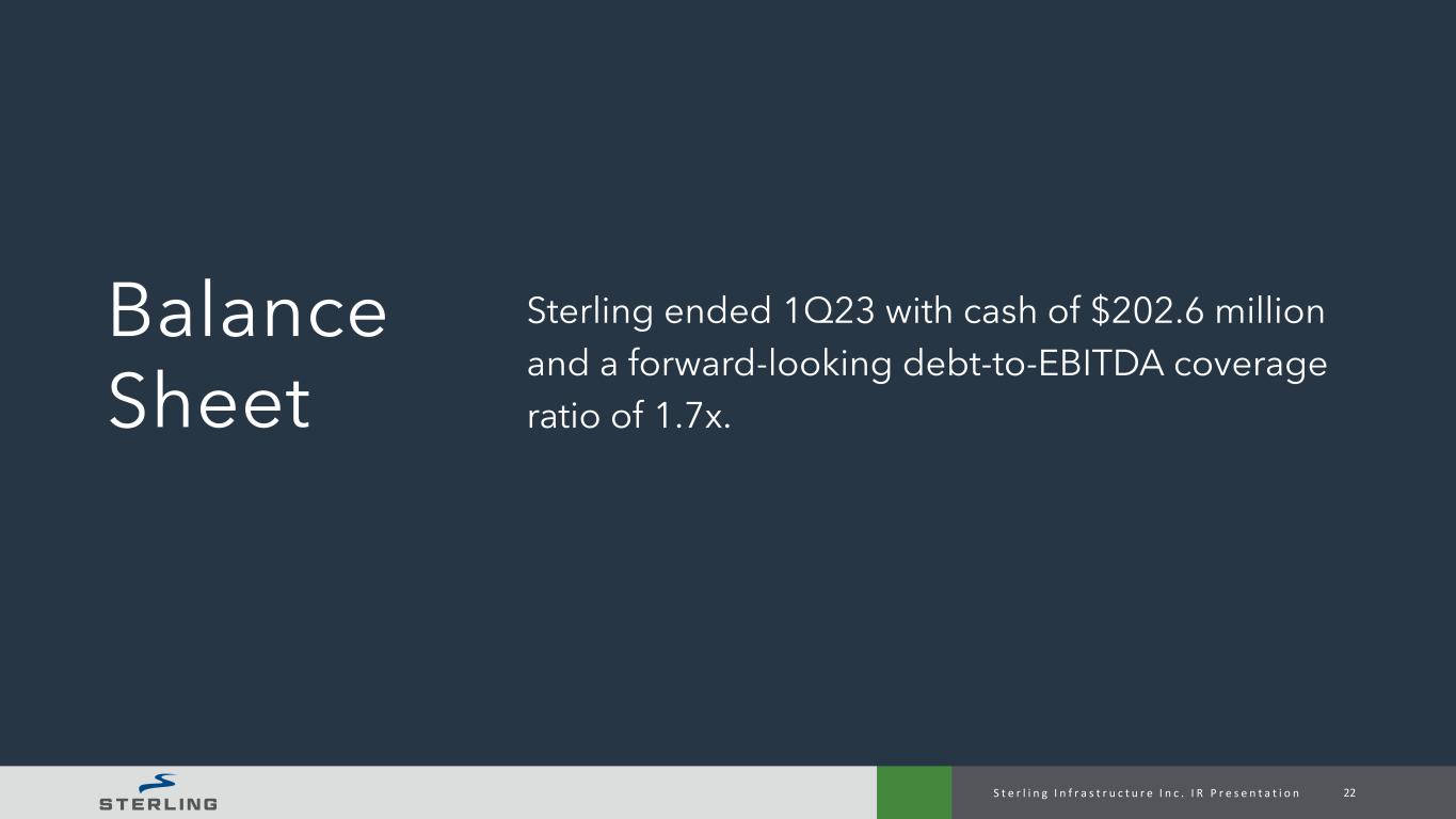S t e r l i n g I n f r a s t r u c t u r e I n c . I R P r e s e n t a t i o n Sterling’s 1Q 2023 Results at a Glance First Quarter 2023 Results from Continuing Operations unless otherwise noted The Company defines EBITDA as GAAP net income from Continuing Operations, adjusted for depreciation and amortization, net interest expense and taxes. See the Non-GAAP Measures” and “EBITDA Reconciliation” slides for more information Cash flow from operations includes both Continuing and Discontinued Operations Revenue grew 10% to $403.6Million Net Income increased 11% to $19.6Million EBITDA of $45.9Million Operating Income increased to $32.6Million Generated $49.1Million in CF from operations Gross Margin increased to 15.3% Diluted EPS increased 8% to $0.64 Cash and Cash Equivalents $202.6Million at March 31, 2023 Stock price increased 15.5% Financial highlights are from continuing operations, and comparisons are to the prior year quarter, unless otherwise noted. 21