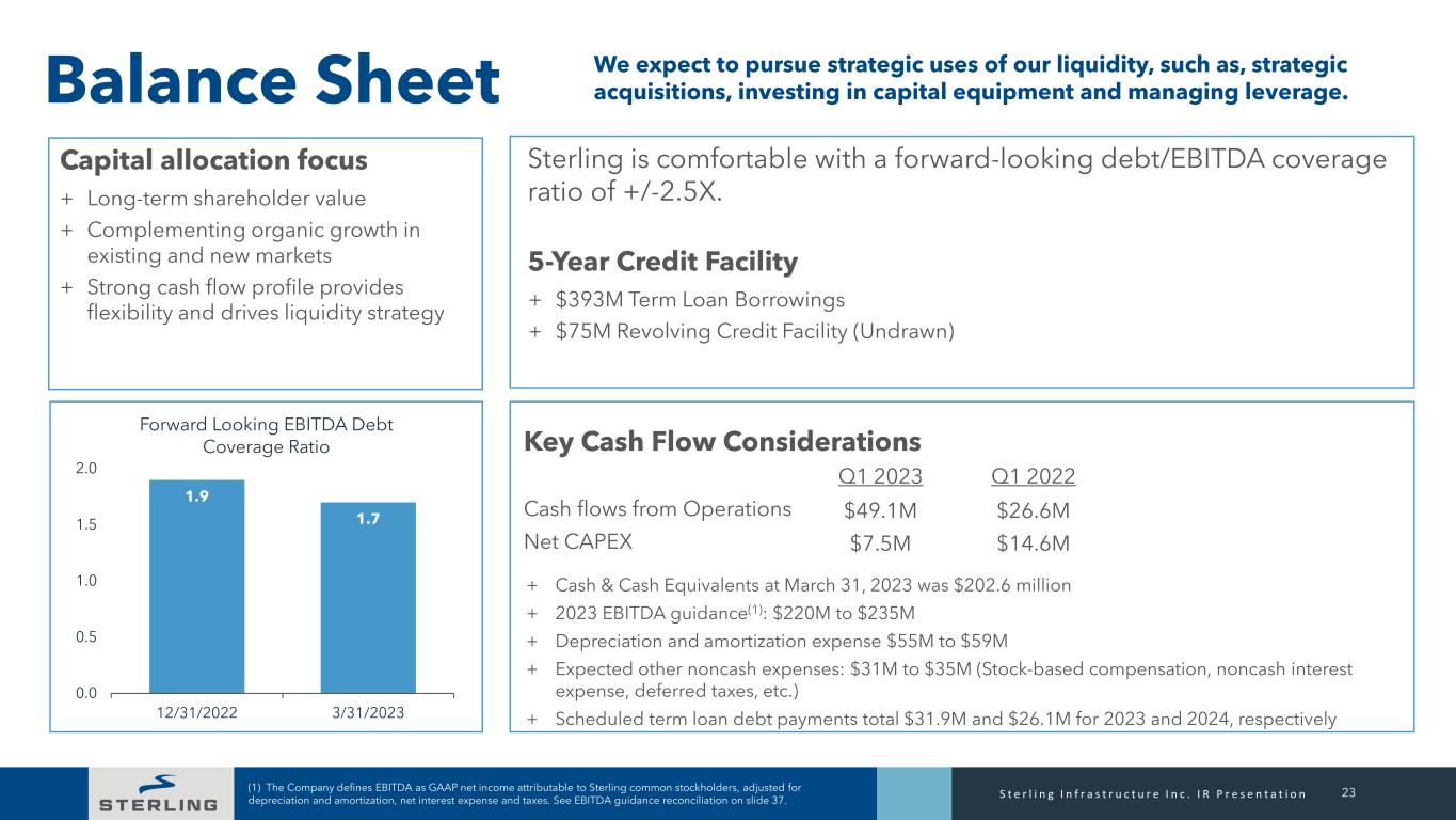 Balance Sheet Sterling ended 1Q23 with cash of $202.6 million and a forward-looking debt-to-EBITDA coverage ratio of 1.7x. S t e r l i n g I n f r a s t r u c t u r e I n c . I R P r e s e n t a t i o n 22