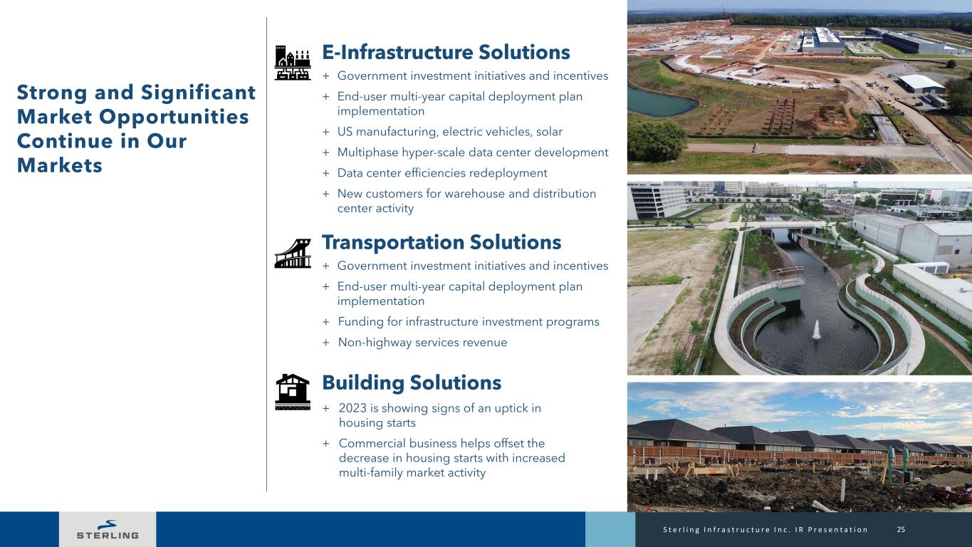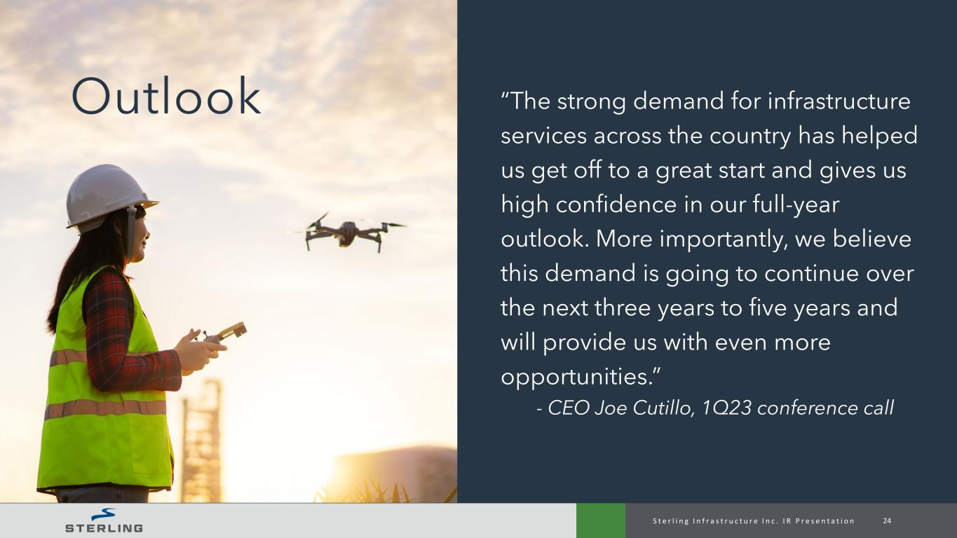Outlook “The strong demand for infrastructure services across the country has helped us get off to a great start and gives us high confidence in our full-year outlook. More importantly, we believe this demand is going to continue over the next three years to five years and will provide us with even more opportunities.” - CEO Joe Cutillo, 1Q23 conference call S t e r l i n g I n f r a s t r u c t u r e I n c . I R P r e s e n t a t i o n 24