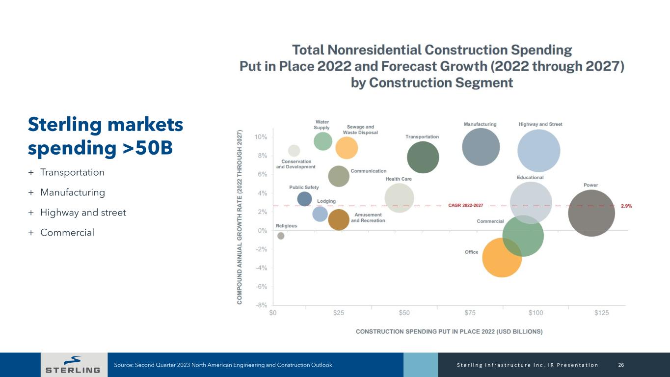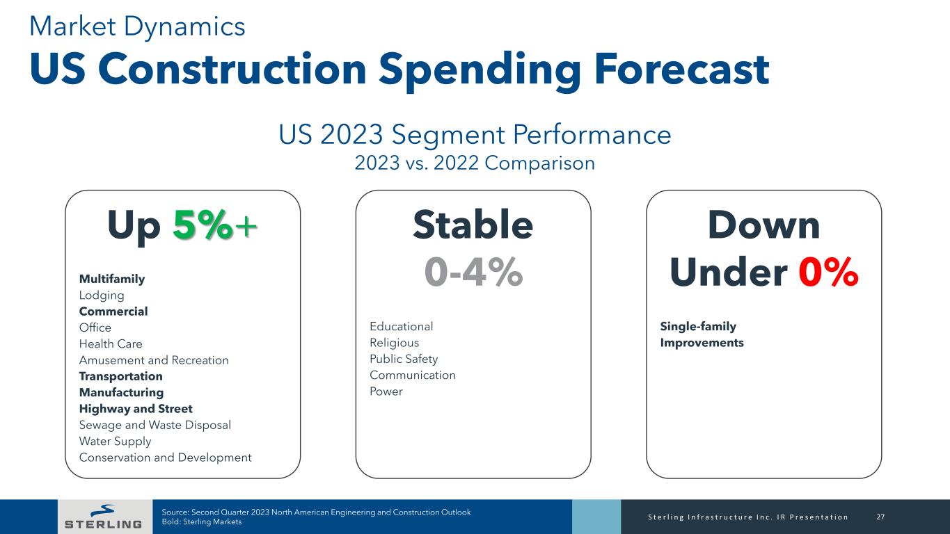 S t e r l i n g I n f r a s t r u c t u r e I n c . I R P r e s e n t a t i o nSource: Second Quarter 2023 North American Engineering and Construction Outlook Sterling markets spending >50B + Transportation + Manufacturing + Highway and street + Commercial 26