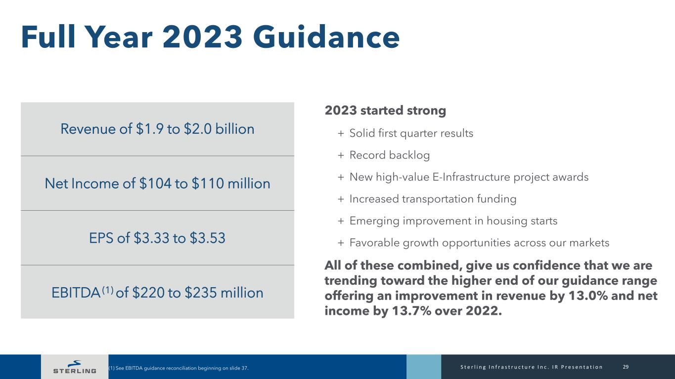 E-Infrastructure Solutions + $65B Infrastructure Bill (IIJA) investment further contributes to growth and demand for data centers, manufacturing, logistics and distribution centers + Continued growth in warehouse, distribution, larger big-box stores investments in e-commerce and manufacturing development + Planned megaprojects for EV, batteries, solar, semiconductors continue + Reshoring of manufacturing capacity continues Transportation Solutions + Infrastructure Bill allocates $643B for transportation programs ($284B incremental), $25B for airports over 5 years. + Over $185B in IIJA funding for 7,000+ transportation projects announced in 2022 + Rail/transit expected growth linked to manufacturing construction growth Building Solutions + Multifamily residential growth offsets decline in Single-family residential + Significant share gain opportunity in Houston and Phoenix Market Positioning and Secular Investment Trends Drive Opportunities for Growth Even in a Challenging Macroeconomic Environment Source: Second Quarter 2023 North American Engineering and Construction Outlook S t e r l i n g I n f r a s t r u c t u r e I n c . I R P r e s e n t a t i o n 28