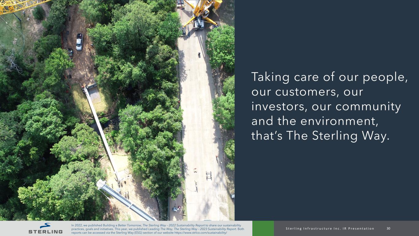 Full Year 2023 Guidance 2023 started strong + Solid first quarter results + Record backlog + New high-value E-Infrastructure project awards + Increased transportation funding + Emerging improvement in housing starts + Favorable growth opportunities across our markets All of these combined, give us confidence that we are trending toward the higher end of our guidance range offering an improvement in revenue by 13.0% and net income by 13.7% over 2022. Revenue of $1.9 to $2.0 billion Net Income of $104 to $110 million EPS of $3.33 to $3.53 EBITDA (1) of $220 to $235 million S t e r l i n g I n f r a s t r u c t u r e I n c . I R P r e s e n t a t i o n 29(1) See EBITDA guidance reconciliation beginning on slide 37.
