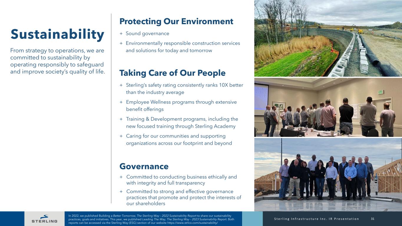 Taking care of our people, our customers, our investors, our community and the environment, that’s The Sterling Way. 30S t e r l i n g I n f r a s t r u c t u r e I n c . I R P r e s e n t a t i o n In 2022, we published Building a Better Tomorrow, The Sterling Way – 2022 Sustainability Report to share our sustainability practices, goals and initiatives. This year, we published Leading The Way, The Sterling Way – 2023 Sustainability Report. Both reports can be accessed via the Sterling Way (ESG) section of our website https://www.strlco.com/sustainability/