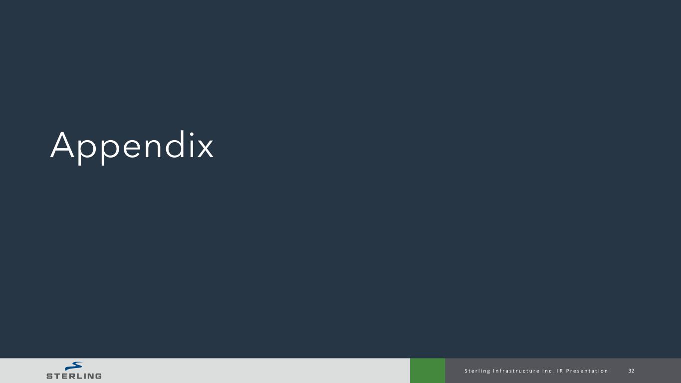 Protecting Our Environment + Sound governance + Environmentally responsible construction services and solutions for today and tomorrow Taking Care of Our People + Sterling’s safety rating consistently ranks 10X better than the industry average + Employee Wellness programs through extensive benefit offerings + Training & Development programs, including the new focused training through Sterling Academy + Caring for our communities and supporting organizations across our footprint and beyond Governance + Committed to conducting business ethically and with integrity and full transparency + Committed to strong and effective governance practices that promote and protect the interests of our shareholders Sustainability S t e r l i n g I n f r a s t r u c t u r e I n c . I R P r e s e n t a t i o n 31 From strategy to operations, we are committed to sustainability by operating responsibly to safeguard and improve society’s quality of life. In 2022, we published Building a Better Tomorrow, The Sterling Way – 2022 Sustainability Report to share our sustainability practices, goals and initiatives. This year, we published Leading The Way, The Sterling Way – 2023 Sustainability Report. Both reports can be accessed via the Sterling Way (ESG) section of our website https://www.strlco.com/sustainability/