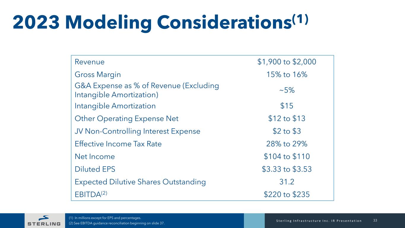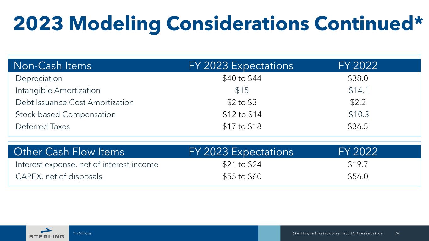 33 Revenue $1,900 to $2,000 Gross Margin 15% to 16% G&A Expense as % of Revenue (Excluding Intangible Amortization) ~5% Intangible Amortization $15 Other Operating Expense Net $12 to $13 JV Non-Controlling Interest Expense $2 to $3 Effective Income Tax Rate 28% to 29% Net Income $104 to $110 Diluted EPS $3.33 to $3.53 Expected Dilutive Shares Outstanding 31.2 EBITDA(2) $220 to $235 2023 Modeling Considerations(1) (1) In millions except for EPS and percentages. (2) See EBITDA guidance reconciliation beginning on slide 37. S t e r l i n g I n f r a s t r u c t u r e I n c . I R P r e s e n t a t i o n