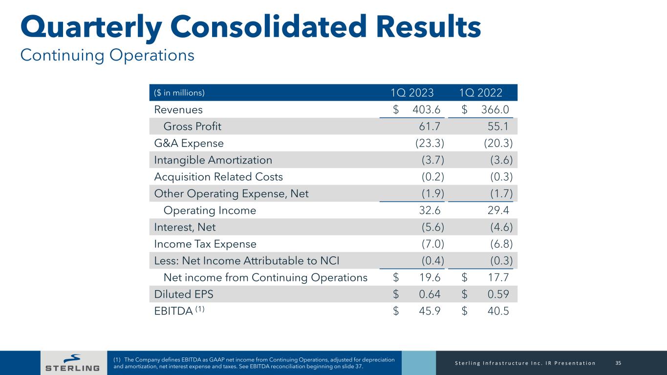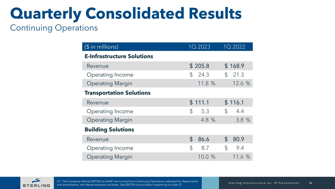 ($ in millions) 1Q 2023 1Q 2022 Revenues $ 403.6 $ 366.0 Gross Profit 61.7 55.1 G&A Expense (23.3) (20.3) Intangible Amortization (3.7) (3.6) Acquisition Related Costs (0.2) (0.3) Other Operating Expense, Net (1.9) (1.7) Operating Income 32.6 29.4 Interest, Net (5.6) (4.6) Income Tax Expense (7.0) (6.8) Less: Net Income Attributable to NCI (0.4) (0.3) Net income from Continuing Operations $ 19.6 $ 17.7 Diluted EPS $ 0.64 $ 0.59 EBITDA (1) $ 45.9 $ 40.5 Quarterly Consolidated Results Continuing Operations (1) The Company defines EBITDA as GAAP net income from Continuing Operations, adjusted for depreciation and amortization, net interest expense and taxes. See EBITDA reconciliation beginning on slide 37. S t e r l i n g I n f r a s t r u c t u r e I n c . I R P r e s e n t a t i o n 35