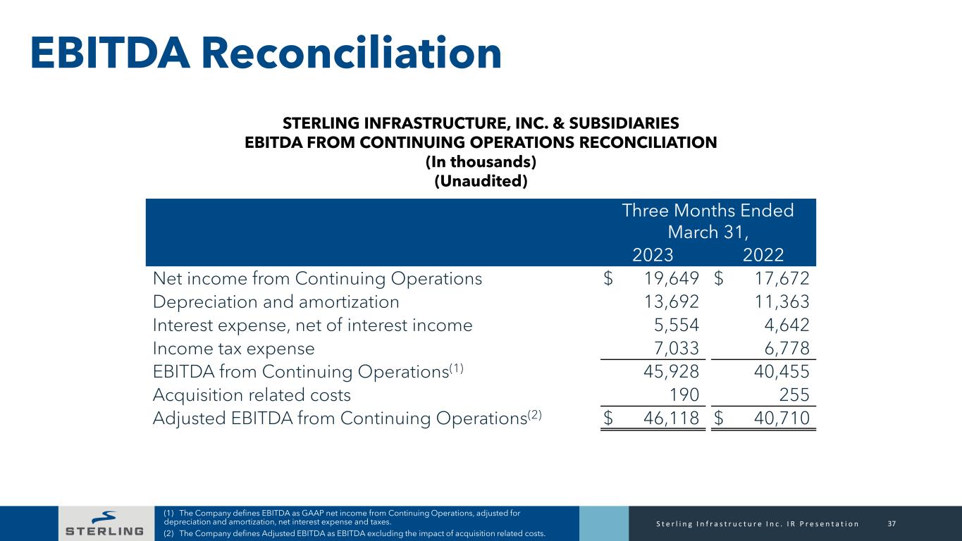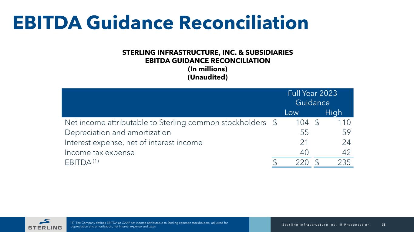 Three Months Ended March 31, 2023 2022 Net income from Continuing Operations $ 19,649 $ 17,672 Depreciation and amortization 13,692 11,363 Interest expense, net of interest income 5,554 4,642 Income tax expense 7,033 6,778 EBITDA from Continuing Operations(1) 45,928 40,455 Acquisition related costs 190 255 Adjusted EBITDA from Continuing Operations(2) $ 46,118 $ 40,710 STERLING INFRASTRUCTURE, INC. & SUBSIDIARIES EBITDA FROM CONTINUING OPERATIONS RECONCILIATION (In thousands) (Unaudited) EBITDA Reconciliation (1) The Company defines EBITDA as GAAP net income from Continuing Operations, adjusted for depreciation and amortization, net interest expense and taxes. (2) The Company defines Adjusted EBITDA as EBITDA excluding the impact of acquisition related costs. S t e r l i n g I n f r a s t r u c t u r e I n c . I R P r e s e n t a t i o n 37