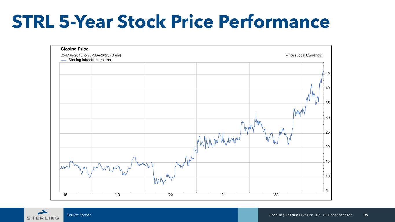 Full Year 2023 Guidance Low High Net income attributable to Sterling common stockholders $ 104 $ 110 Depreciation and amortization 55 59 Interest expense, net of interest income 21 24 Income tax expense 40 42 EBITDA (1) $ 220 $ 235 STERLING INFRASTRUCTURE, INC. & SUBSIDIARIES EBITDA GUIDANCE RECONCILIATION (In millions) (Unaudited) EBITDA Guidance Reconciliation (1) The Company defines EBITDA as GAAP net income attributable to Sterling common stockholders, adjusted for depreciation and amortization, net interest expense and taxes. S t e r l i n g I n f r a s t r u c t u r e I n c . I R P r e s e n t a t i o n 38