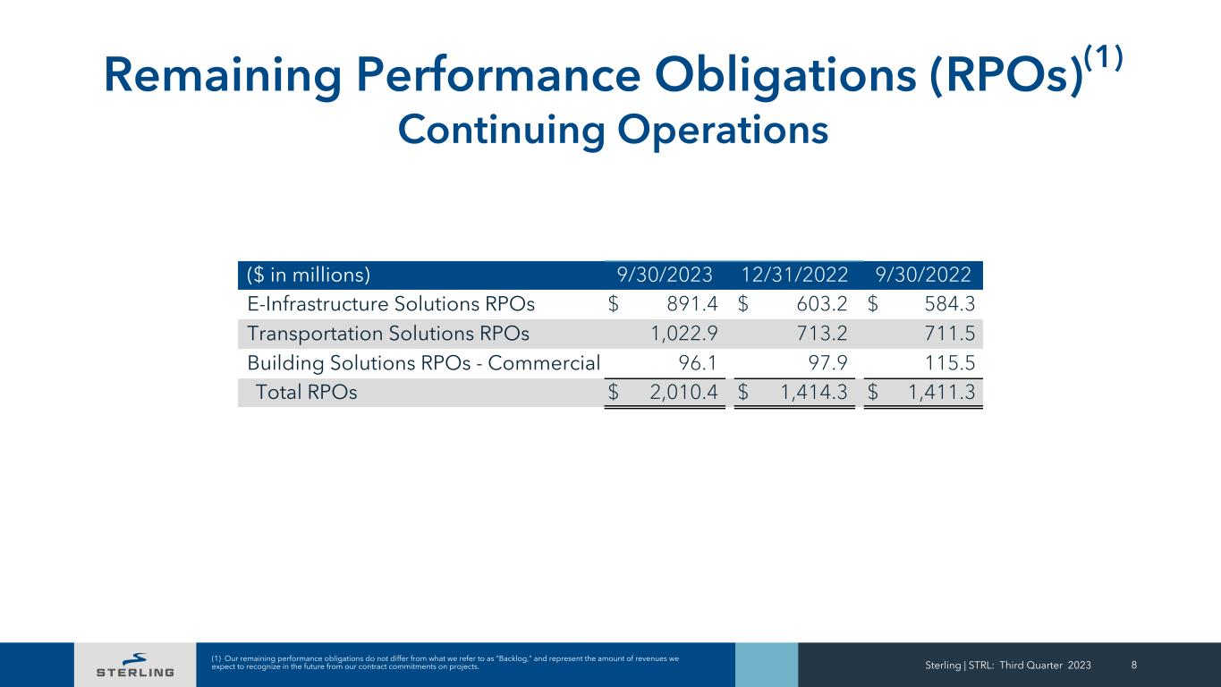 Sterling | STRL: Third Quarter 2023 7 Quarterly Consolidated and Segment Results Continuing Operations ($ in millions) Q3 2023 Q3 2022 Revenues $ 560.3 $ 493.0 Gross Profit 91.9 79.4 G&A Expense (25.2) (22.2) Intangible Amortization (3.7) (3.5) Acquisition Related Costs (0.1) (0.1) Other Operating Expense, Net (5.7) (4.1) Operating Income 57.1 49.5 Interest, Net (3.1) (5.0) Income Tax Expense (13.9) (13.2) Less: Net Income Attributable to NCI (0.8) (0.6) Net income from Continuing Operations $ 39.4 $ 30.7 Diluted EPS $ 1.26 $ 1.01 EBITDA (1) $ 71.2 $ 61.6 ($ in millions) Q3 2023 Q3 2022 E-Infrastructure Solutions Revenue $ 253.9 $ 255.5 Operating Income $ 35.9 $ 37.5 Operating Margin 14.2 % 14.7 % Transportation Solutions Revenue $ 193.0 $ 157.2 Operating Income $ 14.5 $ 9.7 Operating Margin 7.5 % 6.2 % Building Solutions Revenue $ 113.4 $ 80.3 Operating Income $ 12.8 $ 9.3 Operating Margin 11.3 % 11.6 % (1) The Company defines EBITDA as GAAP net income from Continuing Operations, adjusted for depreciation and amortization, net interest expense and taxes. See EBITDA reconciliation on page 14.