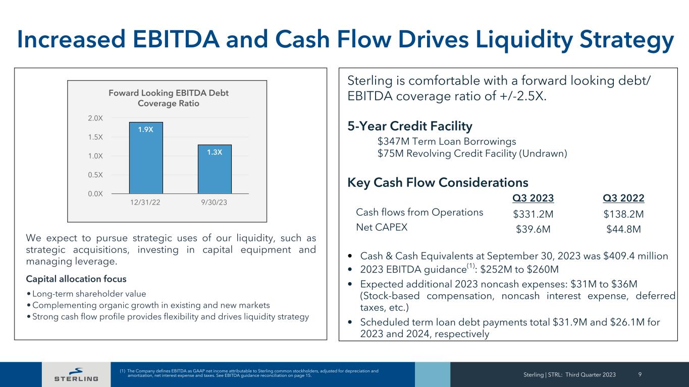 Sterling | STRL: Third Quarter 2023 8 Remaining Performance Obligations (RPOs)(1) Continuing Operations ($ in millions) 9/30/2023 12/31/2022 9/30/2022 E-Infrastructure Solutions RPOs $ 891.4 $ 603.2 $ 584.3 Transportation Solutions RPOs 1,022.9 713.2 711.5 Building Solutions RPOs - Commercial 96.1 97.9 115.5 Total RPOs $ 2,010.4 $ 1,414.3 $ 1,411.3 (1) Our remaining performance obligations do not differ from what we refer to as “Backlog,” and represent the amount of revenues we expect to recognize in the future from our contract commitments on projects.