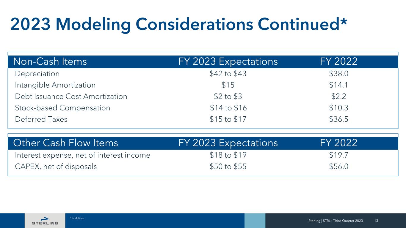 Sterling | STRL: Third Quarter 2023 12 2023 Modeling Considerations(1) (1) In millions except for EPS and percentages. (2) See EBITDA guidance reconciliation on page 15. Revenue $1,990 to $2,050 Gross Margin 16% to 17% G&A Expense as % of Revenue (Excluding Intangible Amortization) ~5% Intangible Amortization $15 Other Operating Expense Net $17 to $19 JV Non-Controlling Interest Expense $3 to $4 Effective Income Tax Rate ~27% Net Income $128 to $132 Diluted EPS $4.10 to $4.23 Expected Dilutive Shares Outstanding 31.2 EBITDA(2) $252 to $260