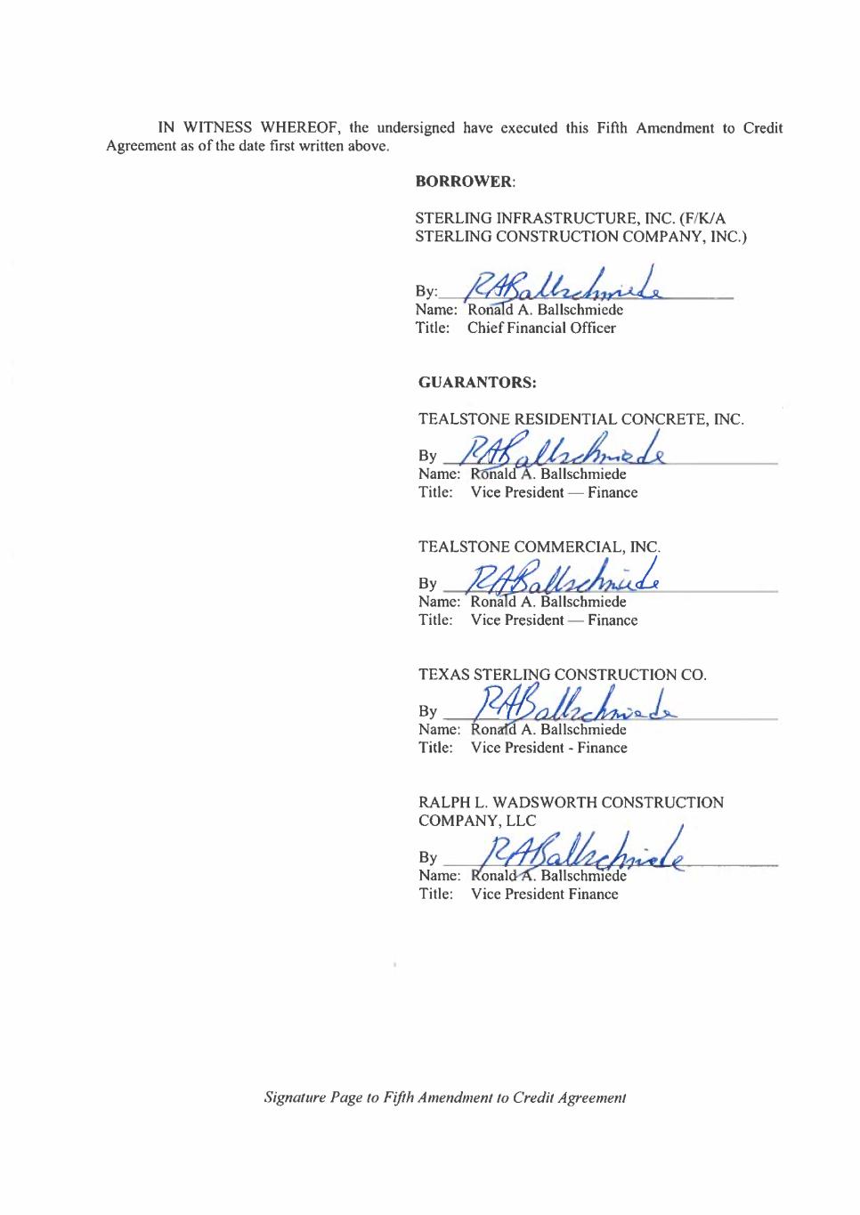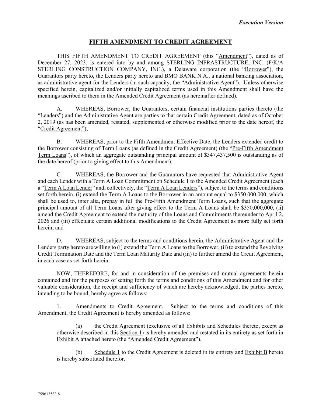 Execution Version 759613533.8 FIFTH AMENDMENT TO CREDIT AGREEMENT THIS FIFTH AMENDMENT TO CREDIT AGREEMENT (this “Amendment”), dated as of December 27, 2023, is entered into by and among STERLING INFRASTRUCTURE, INC. (F/K/A STERLING CONSTRUCTION COMPANY, INC.), a Delaware corporation (the “Borrower”), the Guarantors party hereto, the Lenders party hereto and BMO BANK N.A., a national banking association, as administrative agent for the Lenders (in such capacity, the “Administrative Agent”). Unless otherwise specified herein, capitalized and/or initially capitalized terms used in this Amendment shall have the meanings ascribed to them in the Amended Credit Agreement (as hereinafter defined). A. WHEREAS, Borrower, the Guarantors, certain financial institutions parties thereto (the “Lenders”) and the Administrative Agent are parties to that certain Credit Agreement, dated as of October 2, 2019 (as has been amended, restated, supplemented or otherwise modified prior to the date hereof, the “Credit Agreement”); B. WHEREAS, prior to the Fifth Amendment Effective Date, the Lenders extended credit to the Borrower consisting of Term Loans (as defined in the Credit Agreement) (the “Pre-Fifth Amendment Term Loans”), of which an aggregate outstanding principal amount of $347,437,500 is outstanding as of the date hereof (prior to giving effect to this Amendment); C. WHEREAS, the Borrower and the Guarantors have requested that Administrative Agent and each Lender with a Term A Loan Commitment on Schedule 1 to the Amended Credit Agreement (each a “Term A Loan Lender” and, collectively, the “Term A Loan Lenders”), subject to the terms and conditions set forth herein, (i) extend the Term A Loans to the Borrower in an amount equal to $350,000,000, which shall be used to, inter alia, prepay in full the Pre-Fifth Amendment Term Loans, such that the aggregate principal amount of all Term Loans after giving effect to the Term A Loans shall be $350,000,000, (ii) amend the Credit Agreement to extend the maturity of the Loans and Commitments thereunder to April 2, 2026 and (iii) effectuate certain additional modifications to the Credit Agreement as more fully set forth herein; and D. WHEREAS, subject to the terms and conditions herein, the Administrative Agent and the Lenders party hereto are willing to (i) extend the Term A Loans to the Borrower, (ii) to extend the Revolving Credit Termination Date and the Term Loan Maturity Date and (iii) to further amend the Credit Agreement, in each case as set forth herein. NOW, THEREFORE, for and in consideration of the premises and mutual agreements herein contained and for the purposes of setting forth the terms and conditions of this Amendment and for other valuable consideration, the receipt and sufficiency of which are hereby acknowledged, the parties hereto, intending to be bound, hereby agree as follows: 1. Amendments to Credit Agreement. Subject to the terms and conditions of this Amendment, the Credit Agreement is hereby amended as follows: (a) the Credit Agreement (exclusive of all Exhibits and Schedules thereto, except as otherwise described in this Section 1) is hereby amended and restated in its entirety as set forth in Exhibit A attached hereto (the “Amended Credit Agreement”). (b) Schedule 1 to the Credit Agreement is deleted in its entirety and Exhibit B hereto is hereby substituted therefor.
