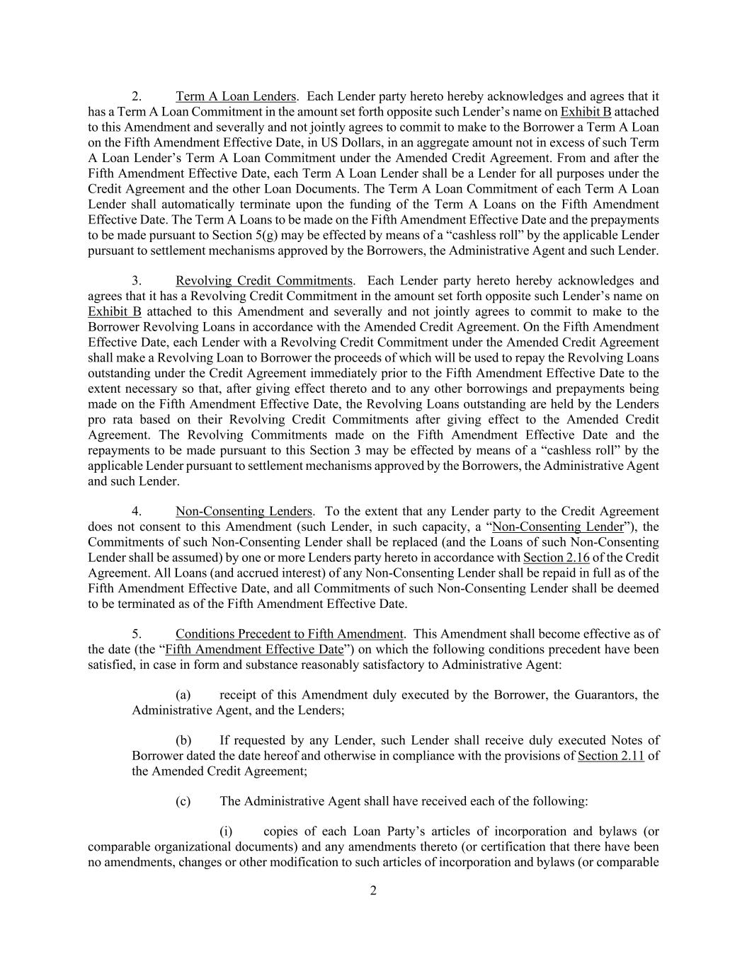 2 2. Term A Loan Lenders. Each Lender party hereto hereby acknowledges and agrees that it has a Term A Loan Commitment in the amount set forth opposite such Lender’s name on Exhibit B attached to this Amendment and severally and not jointly agrees to commit to make to the Borrower a Term A Loan on the Fifth Amendment Effective Date, in US Dollars, in an aggregate amount not in excess of such Term A Loan Lender’s Term A Loan Commitment under the Amended Credit Agreement. From and after the Fifth Amendment Effective Date, each Term A Loan Lender shall be a Lender for all purposes under the Credit Agreement and the other Loan Documents. The Term A Loan Commitment of each Term A Loan Lender shall automatically terminate upon the funding of the Term A Loans on the Fifth Amendment Effective Date. The Term A Loans to be made on the Fifth Amendment Effective Date and the prepayments to be made pursuant to Section 5(g) may be effected by means of a “cashless roll” by the applicable Lender pursuant to settlement mechanisms approved by the Borrowers, the Administrative Agent and such Lender. 3. Revolving Credit Commitments. Each Lender party hereto hereby acknowledges and agrees that it has a Revolving Credit Commitment in the amount set forth opposite such Lender’s name on Exhibit B attached to this Amendment and severally and not jointly agrees to commit to make to the Borrower Revolving Loans in accordance with the Amended Credit Agreement. On the Fifth Amendment Effective Date, each Lender with a Revolving Credit Commitment under the Amended Credit Agreement shall make a Revolving Loan to Borrower the proceeds of which will be used to repay the Revolving Loans outstanding under the Credit Agreement immediately prior to the Fifth Amendment Effective Date to the extent necessary so that, after giving effect thereto and to any other borrowings and prepayments being made on the Fifth Amendment Effective Date, the Revolving Loans outstanding are held by the Lenders pro rata based on their Revolving Credit Commitments after giving effect to the Amended Credit Agreement. The Revolving Commitments made on the Fifth Amendment Effective Date and the repayments to be made pursuant to this Section 3 may be effected by means of a “cashless roll” by the applicable Lender pursuant to settlement mechanisms approved by the Borrowers, the Administrative Agent and such Lender. 4. Non-Consenting Lenders. To the extent that any Lender party to the Credit Agreement does not consent to this Amendment (such Lender, in such capacity, a “Non-Consenting Lender”), the Commitments of such Non-Consenting Lender shall be replaced (and the Loans of such Non-Consenting Lender shall be assumed) by one or more Lenders party hereto in accordance with Section 2.16 of the Credit Agreement. All Loans (and accrued interest) of any Non-Consenting Lender shall be repaid in full as of the Fifth Amendment Effective Date, and all Commitments of such Non-Consenting Lender shall be deemed to be terminated as of the Fifth Amendment Effective Date. 5. Conditions Precedent to Fifth Amendment. This Amendment shall become effective as of the date (the “Fifth Amendment Effective Date”) on which the following conditions precedent have been satisfied, in case in form and substance reasonably satisfactory to Administrative Agent: (a) receipt of this Amendment duly executed by the Borrower, the Guarantors, the Administrative Agent, and the Lenders; (b) If requested by any Lender, such Lender shall receive duly executed Notes of Borrower dated the date hereof and otherwise in compliance with the provisions of Section 2.11 of the Amended Credit Agreement; (c) The Administrative Agent shall have received each of the following: (i) copies of each Loan Party’s articles of incorporation and bylaws (or comparable organizational documents) and any amendments thereto (or certification that there have been no amendments, changes or other modification to such articles of incorporation and bylaws (or comparable