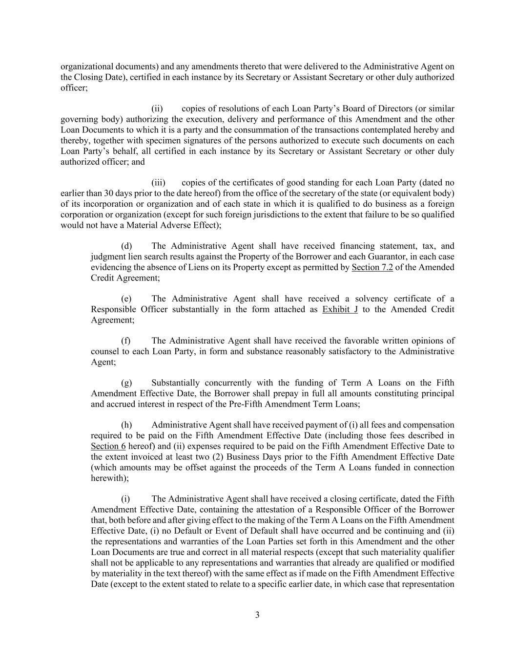 3 organizational documents) and any amendments thereto that were delivered to the Administrative Agent on the Closing Date), certified in each instance by its Secretary or Assistant Secretary or other duly authorized officer; (ii) copies of resolutions of each Loan Party’s Board of Directors (or similar governing body) authorizing the execution, delivery and performance of this Amendment and the other Loan Documents to which it is a party and the consummation of the transactions contemplated hereby and thereby, together with specimen signatures of the persons authorized to execute such documents on each Loan Party’s behalf, all certified in each instance by its Secretary or Assistant Secretary or other duly authorized officer; and (iii) copies of the certificates of good standing for each Loan Party (dated no earlier than 30 days prior to the date hereof) from the office of the secretary of the state (or equivalent body) of its incorporation or organization and of each state in which it is qualified to do business as a foreign corporation or organization (except for such foreign jurisdictions to the extent that failure to be so qualified would not have a Material Adverse Effect); (d) The Administrative Agent shall have received financing statement, tax, and judgment lien search results against the Property of the Borrower and each Guarantor, in each case evidencing the absence of Liens on its Property except as permitted by Section 7.2 of the Amended Credit Agreement; (e) The Administrative Agent shall have received a solvency certificate of a Responsible Officer substantially in the form attached as Exhibit J to the Amended Credit Agreement; (f) The Administrative Agent shall have received the favorable written opinions of counsel to each Loan Party, in form and substance reasonably satisfactory to the Administrative Agent; (g) Substantially concurrently with the funding of Term A Loans on the Fifth Amendment Effective Date, the Borrower shall prepay in full all amounts constituting principal and accrued interest in respect of the Pre-Fifth Amendment Term Loans; (h) Administrative Agent shall have received payment of (i) all fees and compensation required to be paid on the Fifth Amendment Effective Date (including those fees described in Section 6 hereof) and (ii) expenses required to be paid on the Fifth Amendment Effective Date to the extent invoiced at least two (2) Business Days prior to the Fifth Amendment Effective Date (which amounts may be offset against the proceeds of the Term A Loans funded in connection herewith); (i) The Administrative Agent shall have received a closing certificate, dated the Fifth Amendment Effective Date, containing the attestation of a Responsible Officer of the Borrower that, both before and after giving effect to the making of the Term A Loans on the Fifth Amendment Effective Date, (i) no Default or Event of Default shall have occurred and be continuing and (ii) the representations and warranties of the Loan Parties set forth in this Amendment and the other Loan Documents are true and correct in all material respects (except that such materiality qualifier shall not be applicable to any representations and warranties that already are qualified or modified by materiality in the text thereof) with the same effect as if made on the Fifth Amendment Effective Date (except to the extent stated to relate to a specific earlier date, in which case that representation