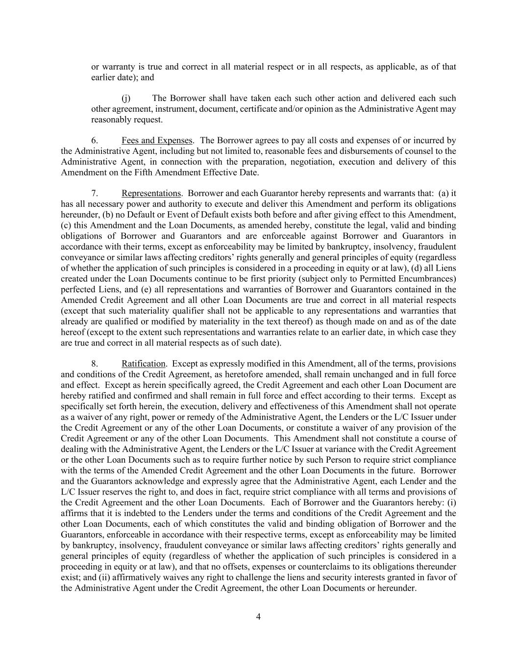 4 or warranty is true and correct in all material respect or in all respects, as applicable, as of that earlier date); and (j) The Borrower shall have taken each such other action and delivered each such other agreement, instrument, document, certificate and/or opinion as the Administrative Agent may reasonably request. 6. Fees and Expenses. The Borrower agrees to pay all costs and expenses of or incurred by the Administrative Agent, including but not limited to, reasonable fees and disbursements of counsel to the Administrative Agent, in connection with the preparation, negotiation, execution and delivery of this Amendment on the Fifth Amendment Effective Date. 7. Representations. Borrower and each Guarantor hereby represents and warrants that: (a) it has all necessary power and authority to execute and deliver this Amendment and perform its obligations hereunder, (b) no Default or Event of Default exists both before and after giving effect to this Amendment, (c) this Amendment and the Loan Documents, as amended hereby, constitute the legal, valid and binding obligations of Borrower and Guarantors and are enforceable against Borrower and Guarantors in accordance with their terms, except as enforceability may be limited by bankruptcy, insolvency, fraudulent conveyance or similar laws affecting creditors’ rights generally and general principles of equity (regardless of whether the application of such principles is considered in a proceeding in equity or at law), (d) all Liens created under the Loan Documents continue to be first priority (subject only to Permitted Encumbrances) perfected Liens, and (e) all representations and warranties of Borrower and Guarantors contained in the Amended Credit Agreement and all other Loan Documents are true and correct in all material respects (except that such materiality qualifier shall not be applicable to any representations and warranties that already are qualified or modified by materiality in the text thereof) as though made on and as of the date hereof (except to the extent such representations and warranties relate to an earlier date, in which case they are true and correct in all material respects as of such date). 8. Ratification. Except as expressly modified in this Amendment, all of the terms, provisions and conditions of the Credit Agreement, as heretofore amended, shall remain unchanged and in full force and effect. Except as herein specifically agreed, the Credit Agreement and each other Loan Document are hereby ratified and confirmed and shall remain in full force and effect according to their terms. Except as specifically set forth herein, the execution, delivery and effectiveness of this Amendment shall not operate as a waiver of any right, power or remedy of the Administrative Agent, the Lenders or the L/C Issuer under the Credit Agreement or any of the other Loan Documents, or constitute a waiver of any provision of the Credit Agreement or any of the other Loan Documents. This Amendment shall not constitute a course of dealing with the Administrative Agent, the Lenders or the L/C Issuer at variance with the Credit Agreement or the other Loan Documents such as to require further notice by such Person to require strict compliance with the terms of the Amended Credit Agreement and the other Loan Documents in the future. Borrower and the Guarantors acknowledge and expressly agree that the Administrative Agent, each Lender and the L/C Issuer reserves the right to, and does in fact, require strict compliance with all terms and provisions of the Credit Agreement and the other Loan Documents. Each of Borrower and the Guarantors hereby: (i) affirms that it is indebted to the Lenders under the terms and conditions of the Credit Agreement and the other Loan Documents, each of which constitutes the valid and binding obligation of Borrower and the Guarantors, enforceable in accordance with their respective terms, except as enforceability may be limited by bankruptcy, insolvency, fraudulent conveyance or similar laws affecting creditors’ rights generally and general principles of equity (regardless of whether the application of such principles is considered in a proceeding in equity or at law), and that no offsets, expenses or counterclaims to its obligations thereunder exist; and (ii) affirmatively waives any right to challenge the liens and security interests granted in favor of the Administrative Agent under the Credit Agreement, the other Loan Documents or hereunder.
