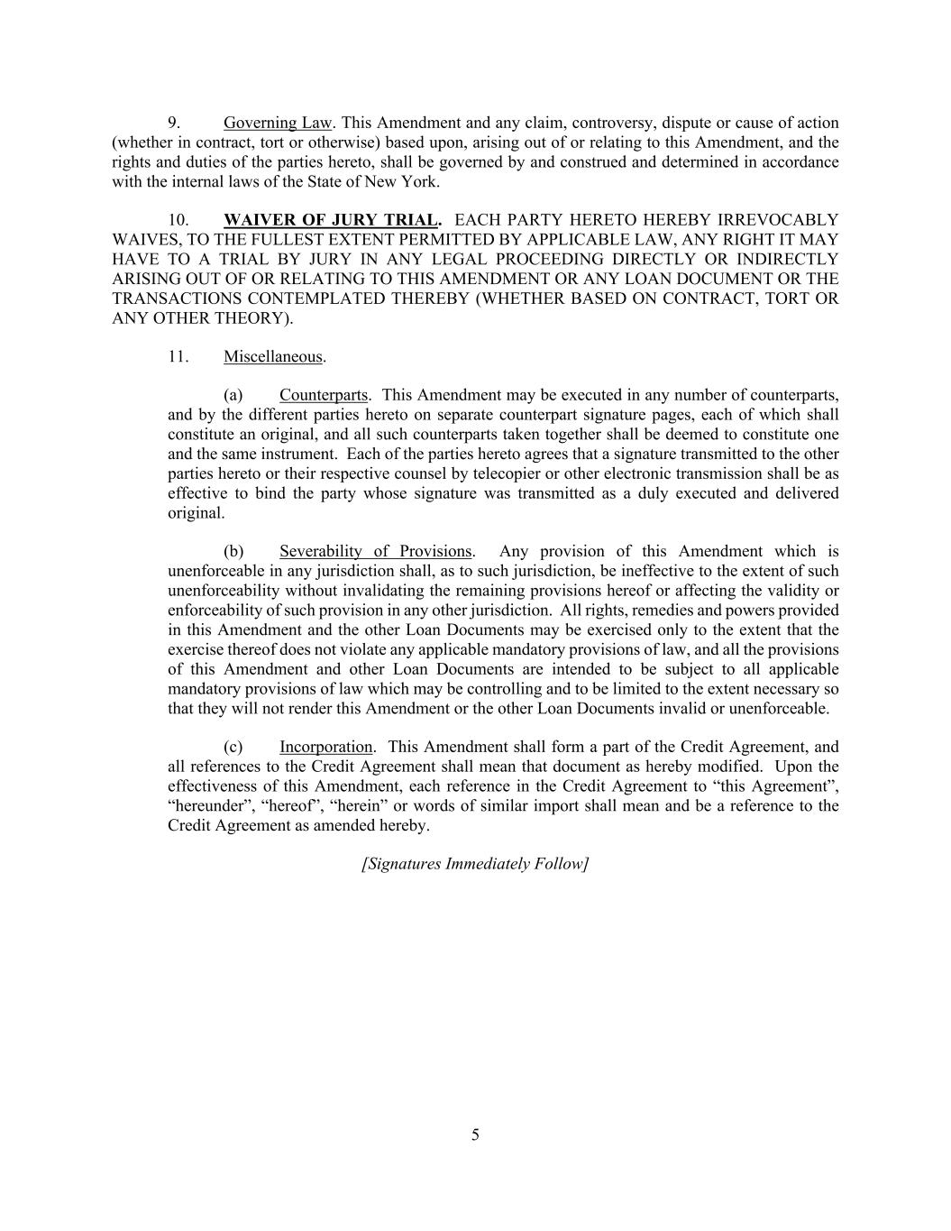 5 9. Governing Law. This Amendment and any claim, controversy, dispute or cause of action (whether in contract, tort or otherwise) based upon, arising out of or relating to this Amendment, and the rights and duties of the parties hereto, shall be governed by and construed and determined in accordance with the internal laws of the State of New York. 10. WAIVER OF JURY TRIAL. EACH PARTY HERETO HEREBY IRREVOCABLY WAIVES, TO THE FULLEST EXTENT PERMITTED BY APPLICABLE LAW, ANY RIGHT IT MAY HAVE TO A TRIAL BY JURY IN ANY LEGAL PROCEEDING DIRECTLY OR INDIRECTLY ARISING OUT OF OR RELATING TO THIS AMENDMENT OR ANY LOAN DOCUMENT OR THE TRANSACTIONS CONTEMPLATED THEREBY (WHETHER BASED ON CONTRACT, TORT OR ANY OTHER THEORY). 11. Miscellaneous. (a) Counterparts. This Amendment may be executed in any number of counterparts, and by the different parties hereto on separate counterpart signature pages, each of which shall constitute an original, and all such counterparts taken together shall be deemed to constitute one and the same instrument. Each of the parties hereto agrees that a signature transmitted to the other parties hereto or their respective counsel by telecopier or other electronic transmission shall be as effective to bind the party whose signature was transmitted as a duly executed and delivered original. (b) Severability of Provisions. Any provision of this Amendment which is unenforceable in any jurisdiction shall, as to such jurisdiction, be ineffective to the extent of such unenforceability without invalidating the remaining provisions hereof or affecting the validity or enforceability of such provision in any other jurisdiction. All rights, remedies and powers provided in this Amendment and the other Loan Documents may be exercised only to the extent that the exercise thereof does not violate any applicable mandatory provisions of law, and all the provisions of this Amendment and other Loan Documents are intended to be subject to all applicable mandatory provisions of law which may be controlling and to be limited to the extent necessary so that they will not render this Amendment or the other Loan Documents invalid or unenforceable. (c) Incorporation. This Amendment shall form a part of the Credit Agreement, and all references to the Credit Agreement shall mean that document as hereby modified. Upon the effectiveness of this Amendment, each reference in the Credit Agreement to “this Agreement”, “hereunder”, “hereof”, “herein” or words of similar import shall mean and be a reference to the Credit Agreement as amended hereby. [Signatures Immediately Follow]