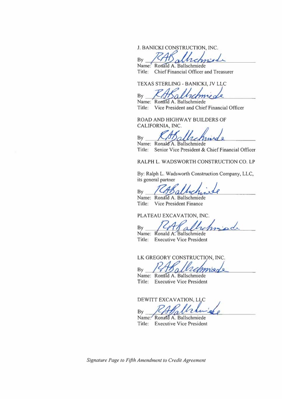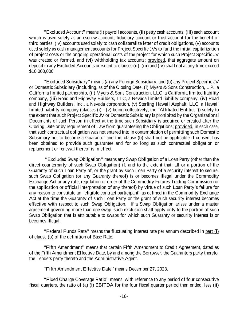 -16- “Excluded Account” means (i) payroll accounts, (ii) petty cash accounts, (iii) each account which is used solely as an escrow account, fiduciary account or trust account for the benefit of third parties, (iv) accounts used solely to cash collateralize letter of credit obligations, (v) accounts used solely as cash management accounts for Project Specific JVs to fund the initial capitalization of project costs or the ongoing operational costs of the project for which such Project Specific JV was created or formed, and (vi) withholding tax accounts; provided, that aggregate amount on deposit in any Excluded Accounts pursuant to clauses (ii), (iii) and (iv) shall not at any time exceed $10,000,000. “Excluded Subsidiary” means (a) any Foreign Subsidiary, and (b) any Project Specific JV or Domestic Subsidiary (including, as of the Closing Date, (i) Myers & Sons Construction, L.P., a California limited partnership, (ii) Myers & Sons Construction, LLC, a California limited liability company, (iii) Road and Highway Builders, LLC, a Nevada limited liability company, (iv) Road and Highway Builders, Inc., a Nevada corporation, (v) Sterling Hawaii Asphalt, LLC, a Hawaii limited liability company (clauses (i) - (v) being collectively, the “Affiliated Entities”)) solely to the extent that such Project Specific JV or Domestic Subsidiary is prohibited by the Organizational Documents of such Person in effect at the time such Subsidiary is acquired or created after the Closing Date or by requirement of Law from guaranteeing the Obligations; provided, in each case, that such contractual obligation was not entered into in contemplation of permitting such Domestic Subsidiary not to become a Guarantor and this clause (b) shall not be applicable if consent has been obtained to provide such guarantee and for so long as such contractual obligation or replacement or renewal thereof is in effect. “Excluded Swap Obligation” means any Swap Obligation of a Loan Party (other than the direct counterparty of such Swap Obligation) if, and to the extent that, all or a portion of the Guaranty of such Loan Party of, or the grant by such Loan Party of a security interest to secure, such Swap Obligation (or any Guaranty thereof) is or becomes illegal under the Commodity Exchange Act or any rule, regulation or order of the Commodity Futures Trading Commission (or the application or official interpretation of any thereof) by virtue of such Loan Party’s failure for any reason to constitute an “eligible contract participant” as defined in the Commodity Exchange Act at the time the Guaranty of such Loan Party or the grant of such security interest becomes effective with respect to such Swap Obligation. If a Swap Obligation arises under a master agreement governing more than one swap, such exclusion shall apply only to the portion of such Swap Obligation that is attributable to swaps for which such Guaranty or security interest is or becomes illegal. “Federal Funds Rate” means the fluctuating interest rate per annum described in part (i) of clause (b) of the definition of Base Rate. “Fifth Amendment” means that certain Fifth Amendment to Credit Agreement, dated as of the Fifth Amendment Effective Date, by and among the Borrower, the Guarantors party thereto, the Lenders party thereto and the Administrative Agent. “Fifth Amendment Effective Date” means December 27, 2023. “Fixed Charge Coverage Ratio” means, with reference to any period of four consecutive fiscal quarters, the ratio of (a) (i) EBITDA for the four fiscal quarter period then ended, less (ii)