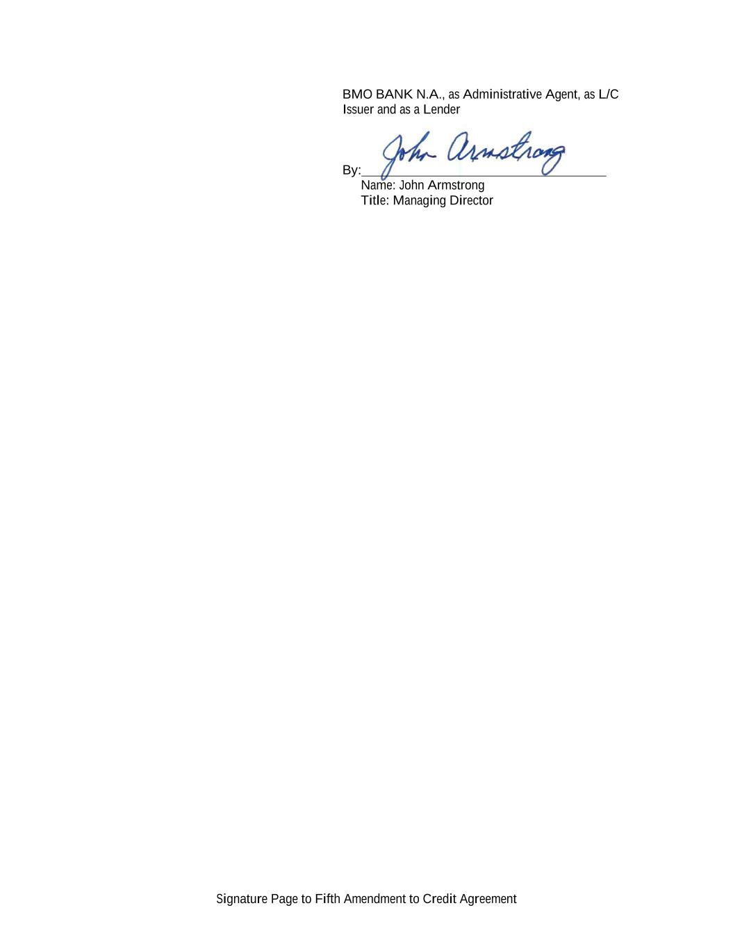 Signature Page to Fifth Amendment to Credit Agreement BMO BANK N.A., as Administrative Agent, as L/C Issuer and as a Lender By: Name: John Armstrong Title: Managing Director
