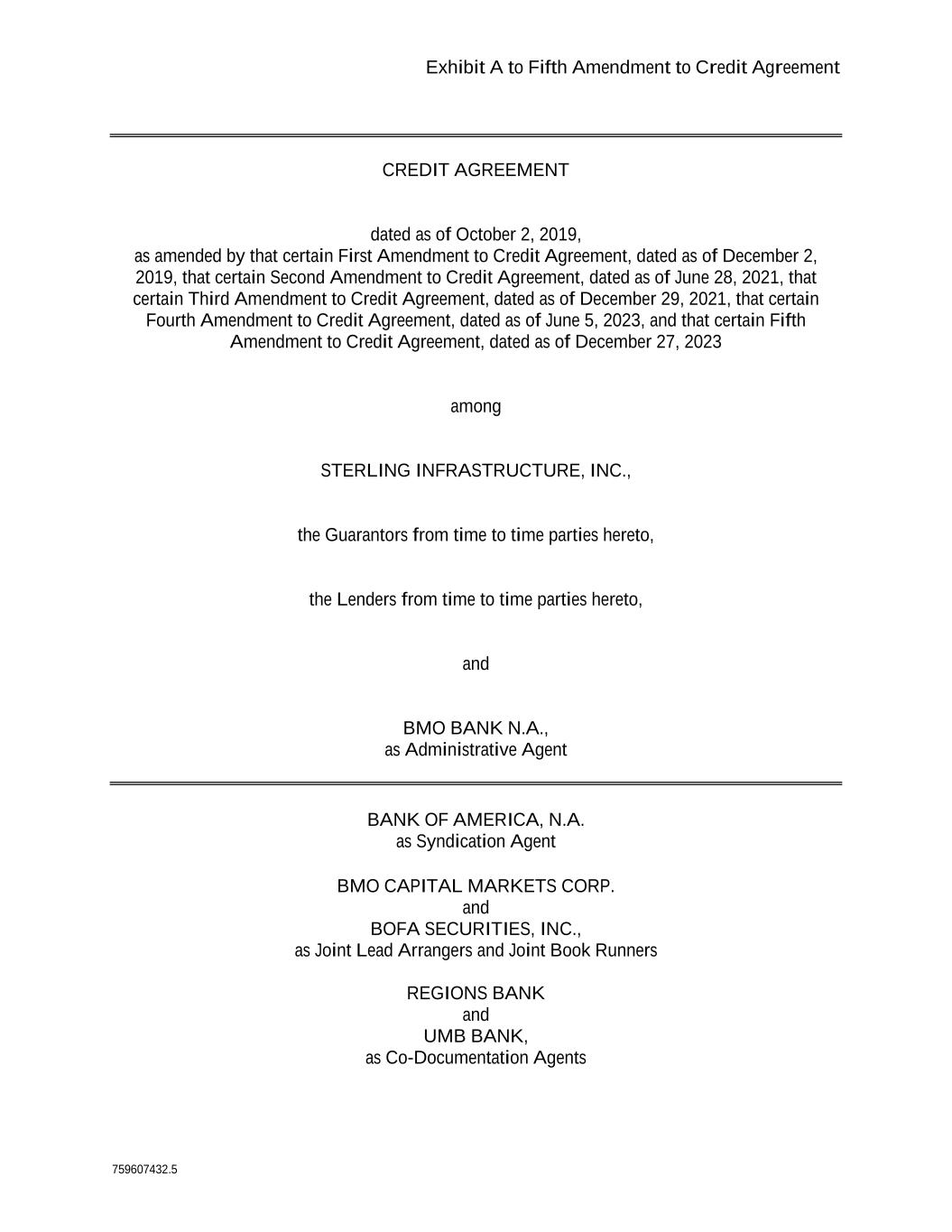 Exhibit A to Fifth Amendment to Credit Agreement 759607432.5 CREDIT AGREEMENT dated as of October 2, 2019, as amended by that certain First Amendment to Credit Agreement, dated as of December 2, 2019, that certain Second Amendment to Credit Agreement, dated as of June 28, 2021, that certain Third Amendment to Credit Agreement, dated as of December 29, 2021, that certain Fourth Amendment to Credit Agreement, dated as of June 5, 2023, and that certain Fifth Amendment to Credit Agreement, dated as of December 27, 2023 among STERLING INFRASTRUCTURE, INC., the Guarantors from time to time parties hereto, the Lenders from time to time parties hereto, and BMO BANK N.A., as Administrative Agent BANK OF AMERICA, N.A. as Syndication Agent BMO CAPITAL MARKETS CORP. and BOFA SECURITIES, INC., as Joint Lead Arrangers and Joint Book Runners REGIONS BANK and UMB BANK, as Co-Documentation Agents