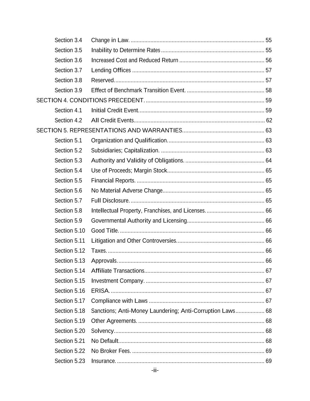 -ii- Section 3.4 Change in Law. ........................................................................................ 55 Section 3.5 Inability to Determine Rates .................................................................... 55 Section 3.6 Increased Cost and Reduced Return ........................................................ 56 Section 3.7 Lending Offices ....................................................................................... 57 Section 3.8 Reserved. .................................................................................................. 57 Section 3.9 Effect of Benchmark Transition Event. ................................................... 58 SECTION 4. CONDITIONS PRECEDENT. .............................................................................. 59 Section 4.1 Initial Credit Event. .................................................................................. 59 Section 4.2 All Credit Events...................................................................................... 62 SECTION 5. REPRESENTATIONS AND WARRANTIES. ..................................................... 63 Section 5.1 Organization and Qualification. ............................................................... 63 Section 5.2 Subsidiaries; Capitalization. .................................................................... 63 Section 5.3 Authority and Validity of Obligations. .................................................... 64 Section 5.4 Use of Proceeds; Margin Stock................................................................ 65 Section 5.5 Financial Reports. .................................................................................... 65 Section 5.6 No Material Adverse Change................................................................... 65 Section 5.7 Full Disclosure. ........................................................................................ 65 Section 5.8 Intellectual Property, Franchises, and Licenses. ...................................... 66 Section 5.9 Governmental Authority and Licensing................................................... 66 Section 5.10 Good Title. ............................................................................................... 66 Section 5.11 Litigation and Other Controversies. ......................................................... 66 Section 5.12 Taxes. ....................................................................................................... 66 Section 5.13 Approvals. ................................................................................................ 66 Section 5.14 Affiliate Transactions............................................................................... 67 Section 5.15 Investment Company. .............................................................................. 67 Section 5.16 ERISA. ..................................................................................................... 67 Section 5.17 Compliance with Laws ............................................................................ 67 Section 5.18 Sanctions; Anti-Money Laundering; Anti-Corruption Laws ................... 68 Section 5.19 Other Agreements. ................................................................................... 68 Section 5.20 Solvency. .................................................................................................. 68 Section 5.21 No Default. ............................................................................................... 68 Section 5.22 No Broker Fees. ....................................................................................... 69 Section 5.23 Insurance. ................................................................................................. 69