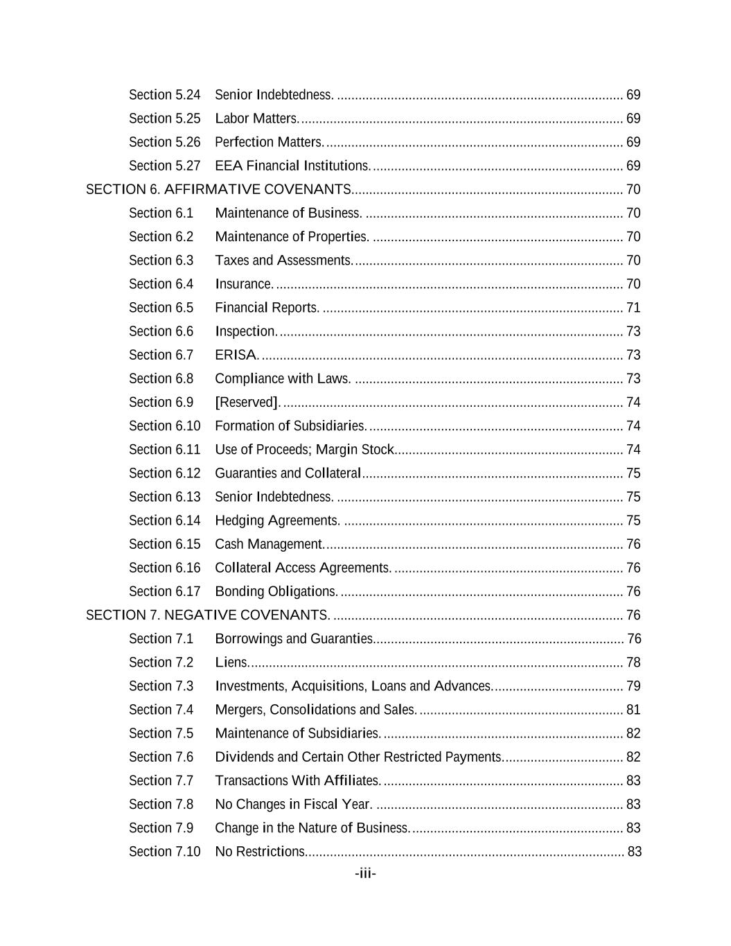 -iii- Section 5.24 Senior Indebtedness. ................................................................................ 69 Section 5.25 Labor Matters. .......................................................................................... 69 Section 5.26 Perfection Matters. ................................................................................... 69 Section 5.27 EEA Financial Institutions. ...................................................................... 69 SECTION 6. AFFIRMATIVE COVENANTS............................................................................ 70 Section 6.1 Maintenance of Business. ........................................................................ 70 Section 6.2 Maintenance of Properties. ...................................................................... 70 Section 6.3 Taxes and Assessments. ........................................................................... 70 Section 6.4 Insurance. ................................................................................................. 70 Section 6.5 Financial Reports. .................................................................................... 71 Section 6.6 Inspection. ................................................................................................ 73 Section 6.7 ERISA. ..................................................................................................... 73 Section 6.8 Compliance with Laws. ........................................................................... 73 Section 6.9 [Reserved]. ............................................................................................... 74 Section 6.10 Formation of Subsidiaries. ....................................................................... 74 Section 6.11 Use of Proceeds; Margin Stock................................................................ 74 Section 6.12 Guaranties and Collateral ......................................................................... 75 Section 6.13 Senior Indebtedness. ................................................................................ 75 Section 6.14 Hedging Agreements. .............................................................................. 75 Section 6.15 Cash Management. ................................................................................... 76 Section 6.16 Collateral Access Agreements. ................................................................ 76 Section 6.17 Bonding Obligations. ............................................................................... 76 SECTION 7. NEGATIVE COVENANTS. ................................................................................. 76 Section 7.1 Borrowings and Guaranties...................................................................... 76 Section 7.2 Liens. ........................................................................................................ 78 Section 7.3 Investments, Acquisitions, Loans and Advances. .................................... 79 Section 7.4 Mergers, Consolidations and Sales. ......................................................... 81 Section 7.5 Maintenance of Subsidiaries. ................................................................... 82 Section 7.6 Dividends and Certain Other Restricted Payments. ................................. 82 Section 7.7 Transactions With Affiliates. ................................................................... 83 Section 7.8 No Changes in Fiscal Year. ..................................................................... 83 Section 7.9 Change in the Nature of Business. ........................................................... 83 Section 7.10 No Restrictions......................................................................................... 83